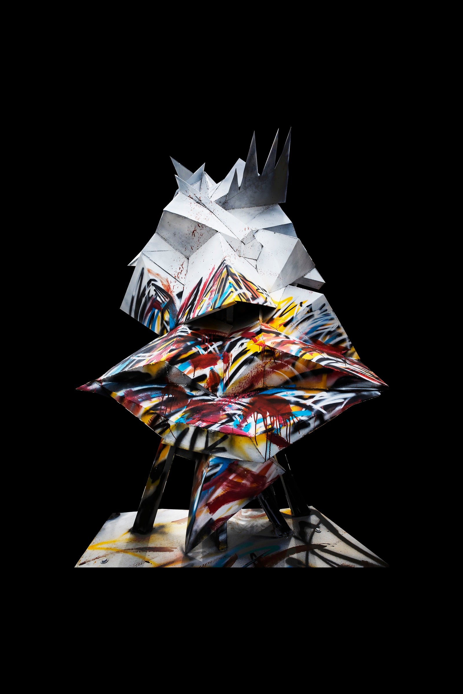 A two sided monument locked in permanent opposition. Male and female emerge as mirrored forces facing outward and never reconciled. White asserts control. Color breaks containment at the base. Union exists only as tension.