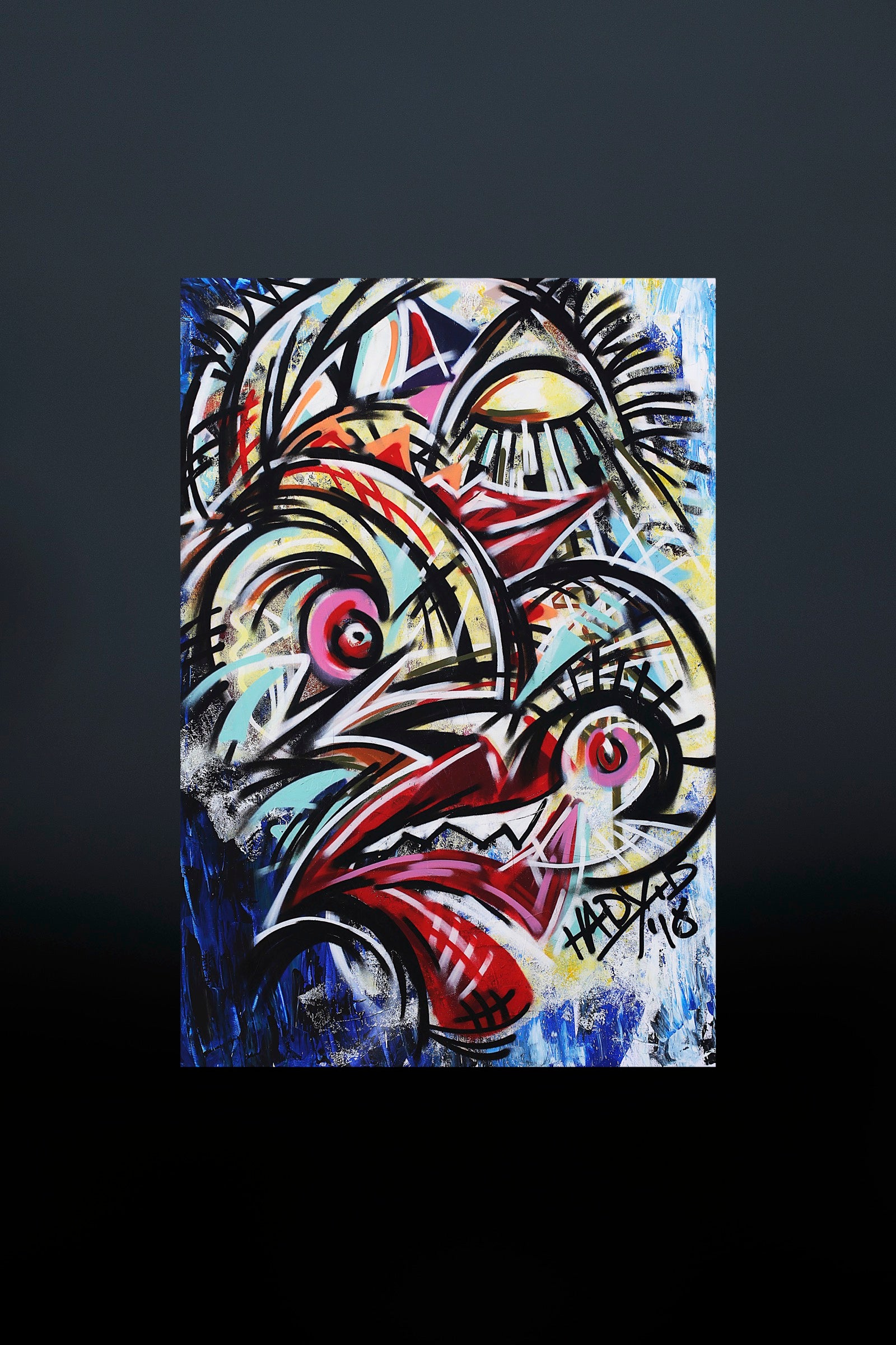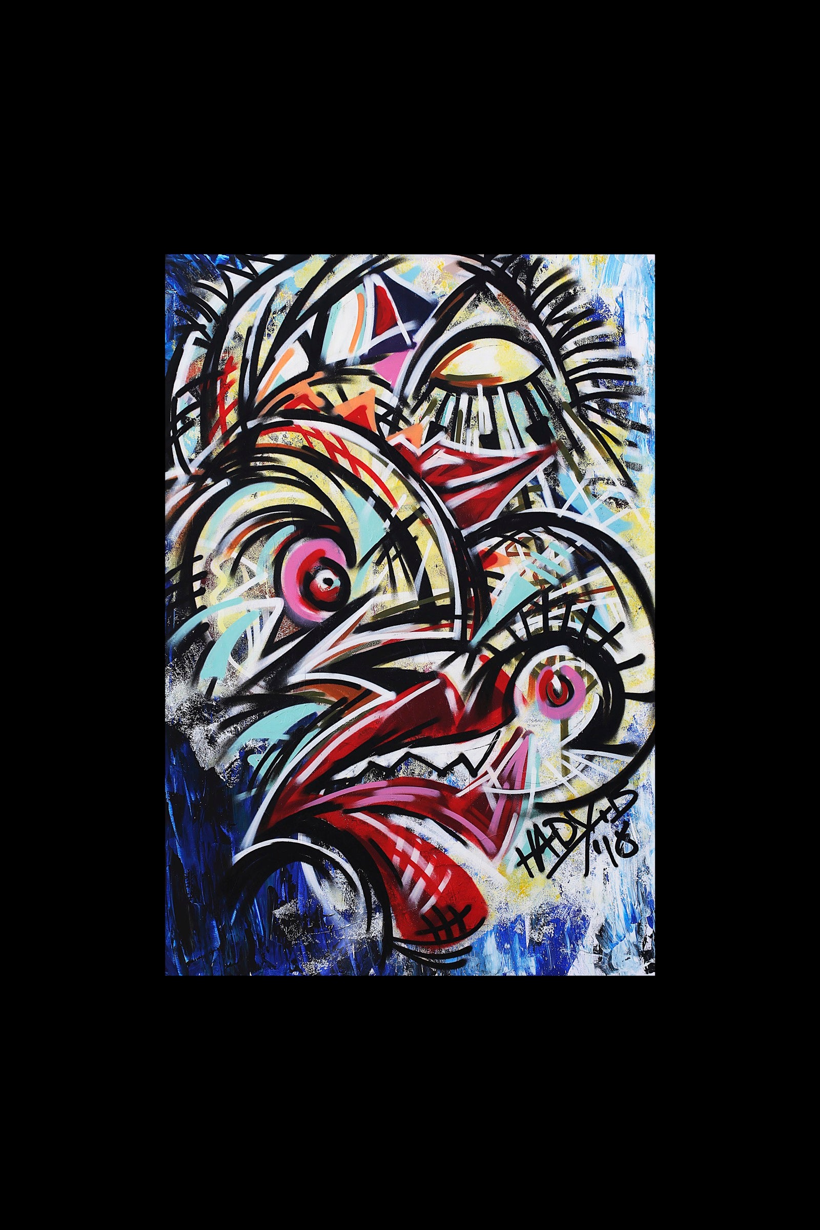 Color behaves like a pulse red black and electric tones colliding and resisting stillness.