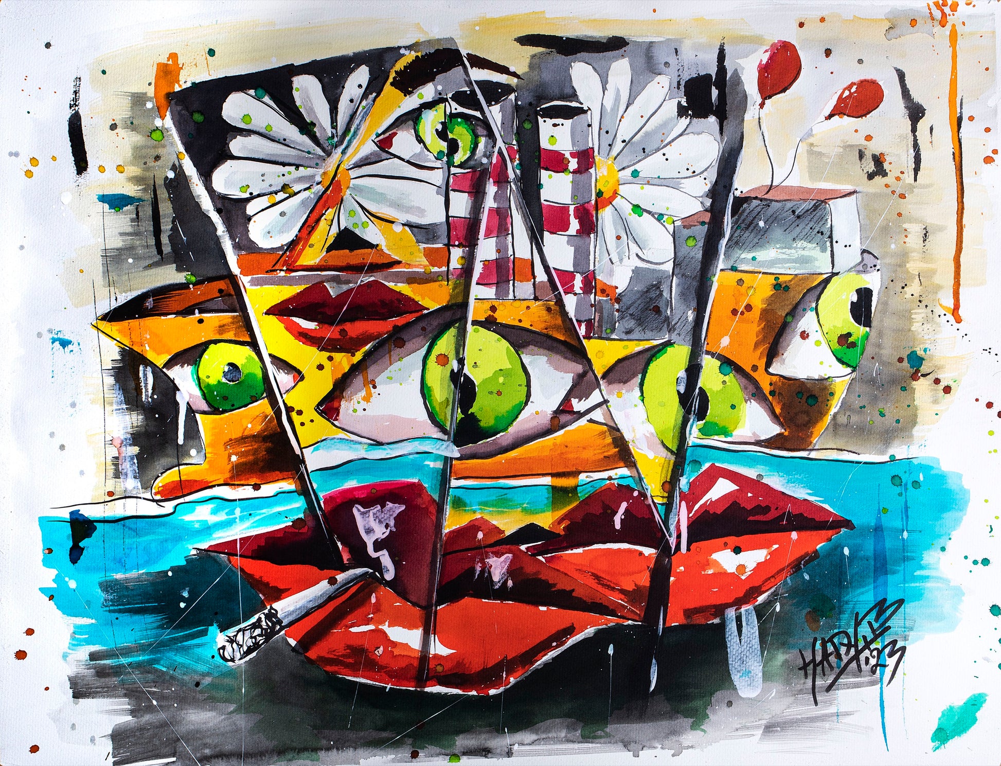 Boat Party is playful chaos held together by instinct and rhythm. Fragmented faces float between celebration and distortion, where joy feels loud and slightly unstable. Color moves fast and loose, driven by impulse rather than control. The work captures a moment of excess and lightness, where everything feels temporary, vivid, and just on the edge of falling apart.