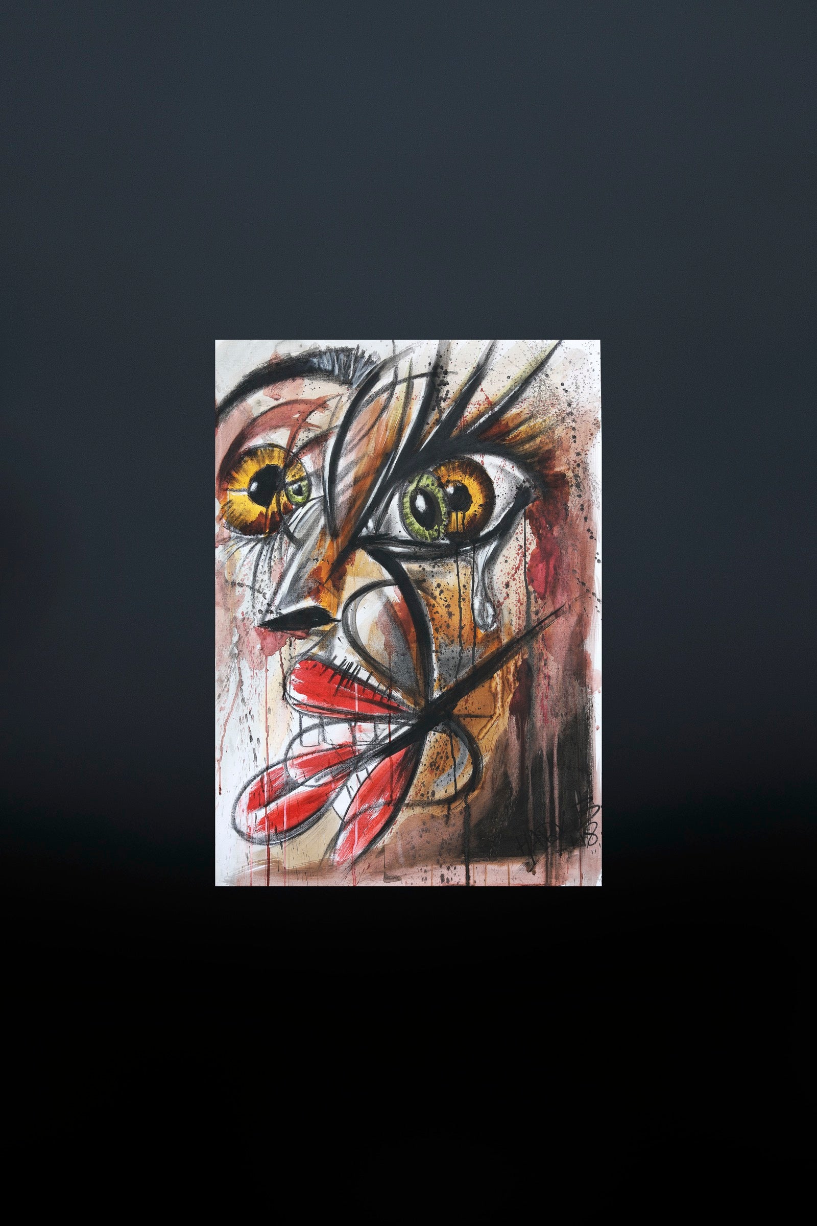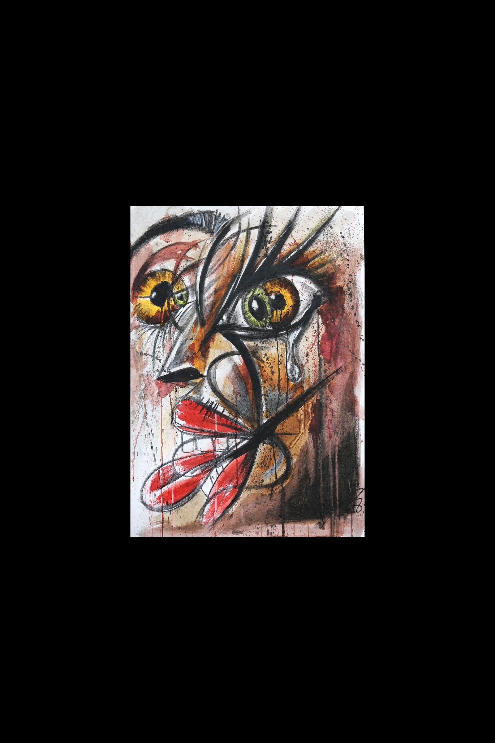 Childhood Trauma confronts the moment where innocence fractures. The face is distorted yet alert, carrying memories that never fully dissolve. The wide eyes hold both fear and awareness, suggesting a child forced to grow too early. This work speaks of emotional imprints that remain beneath the surface, shaping identity long after the moment has passed.