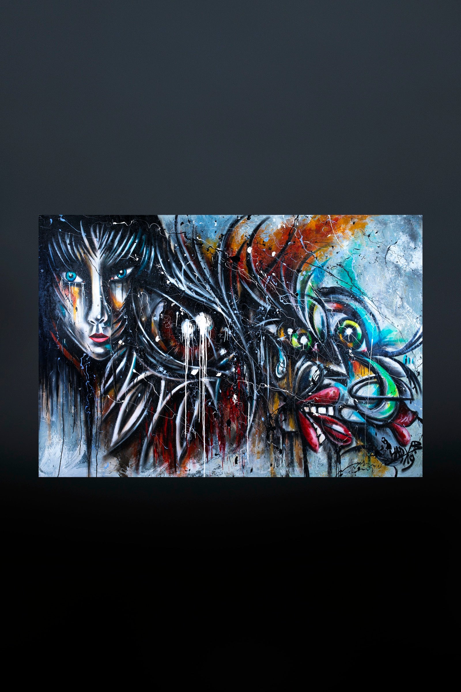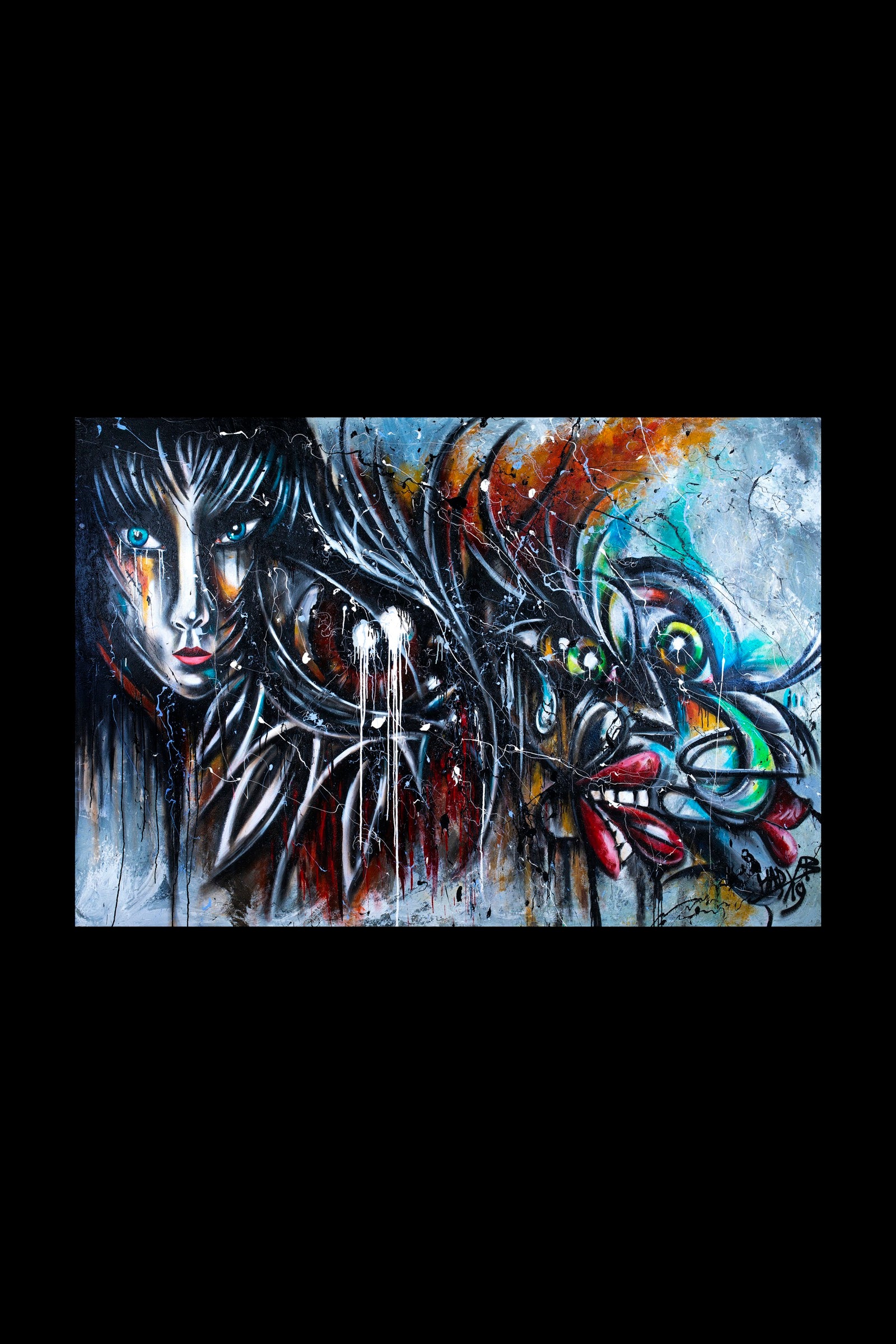 This painting speaks about psychological tension power dynamics and the masks we build to survive ourselves.