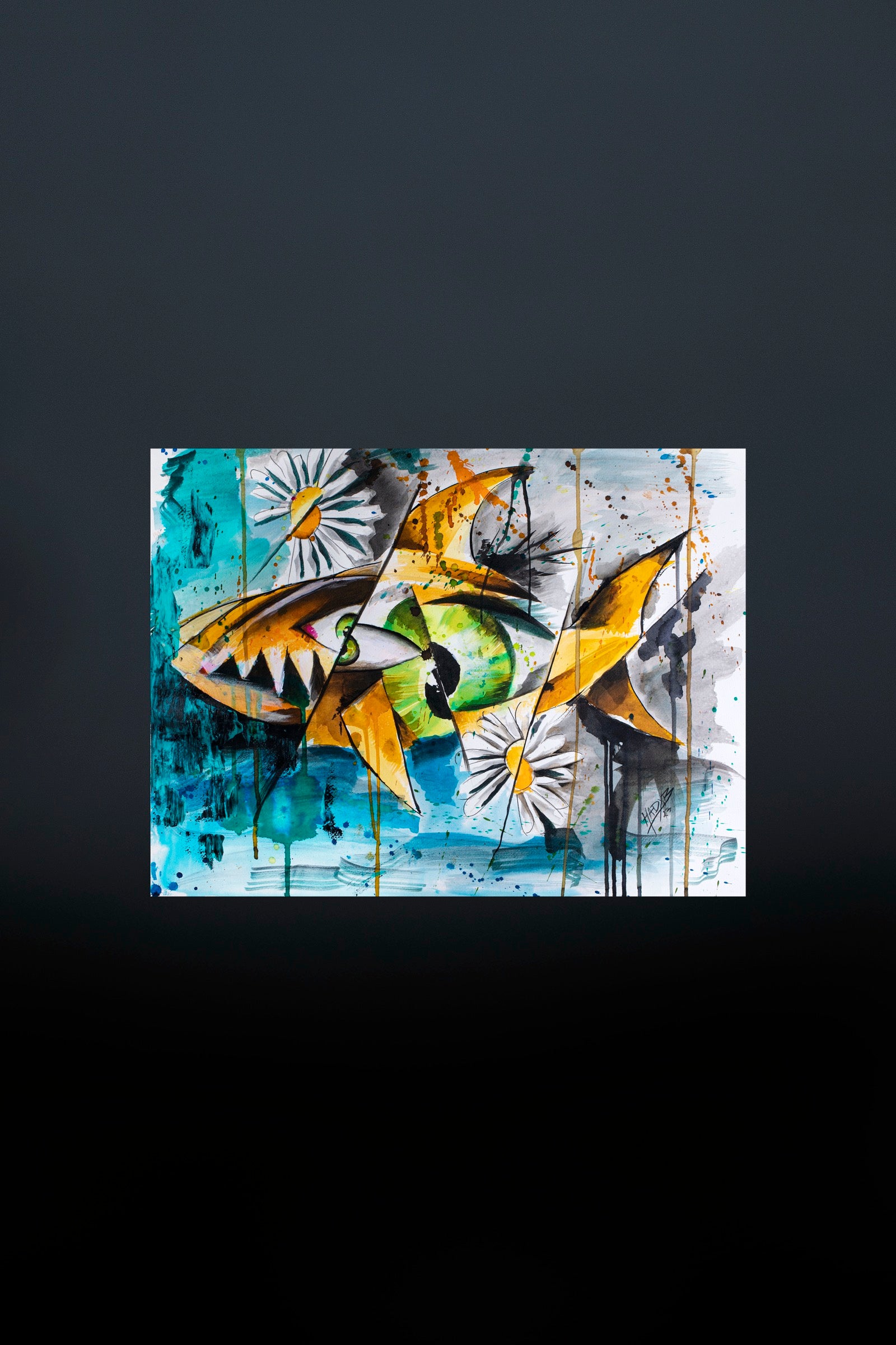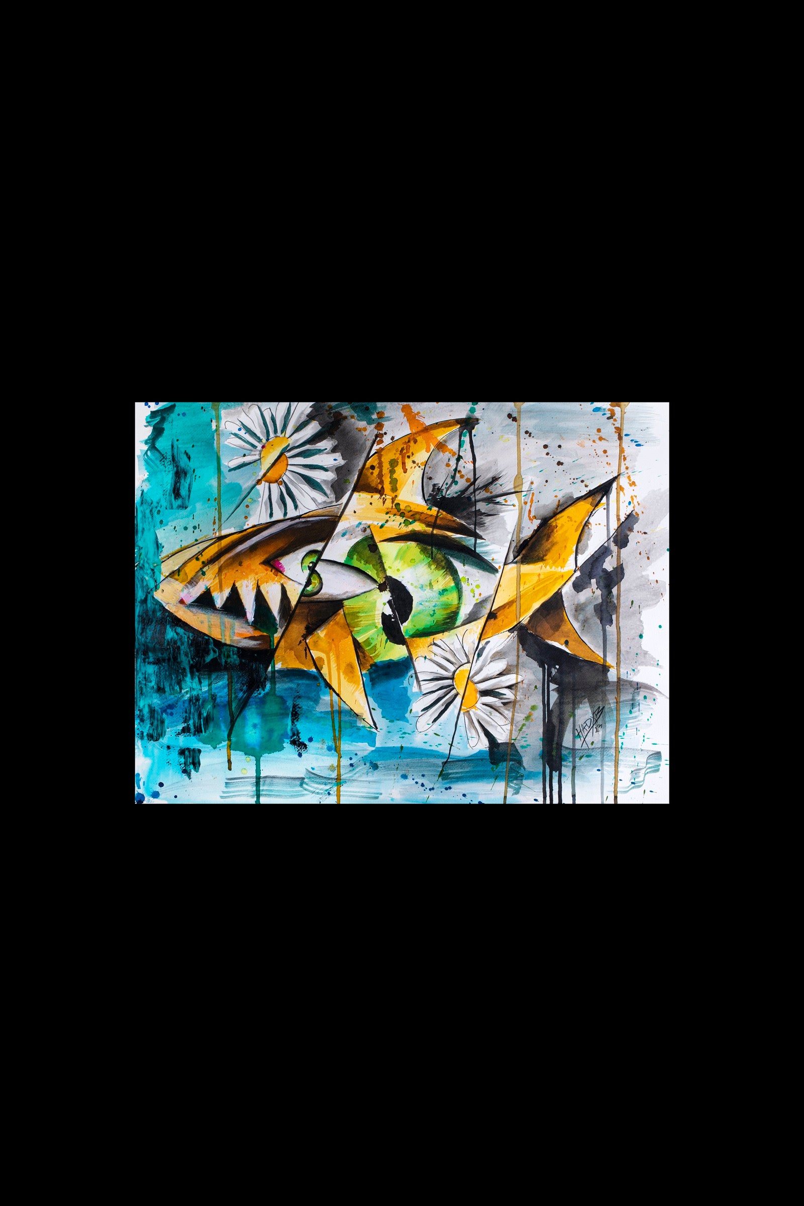 Daisy and the Shark plays with contrast and instinct. Innocence and threat coexist in the same fragile space, where softness meets appetite. The daisy floats as a quiet symbol of vulnerability, while the shark cuts through the composition with sharp intent. Color drips and fractures suggest tension beneath the surface, where beauty and danger are inseparable. The work captures that uneasy balance between curiosity and fear, where attraction exists precisely because of the risk.