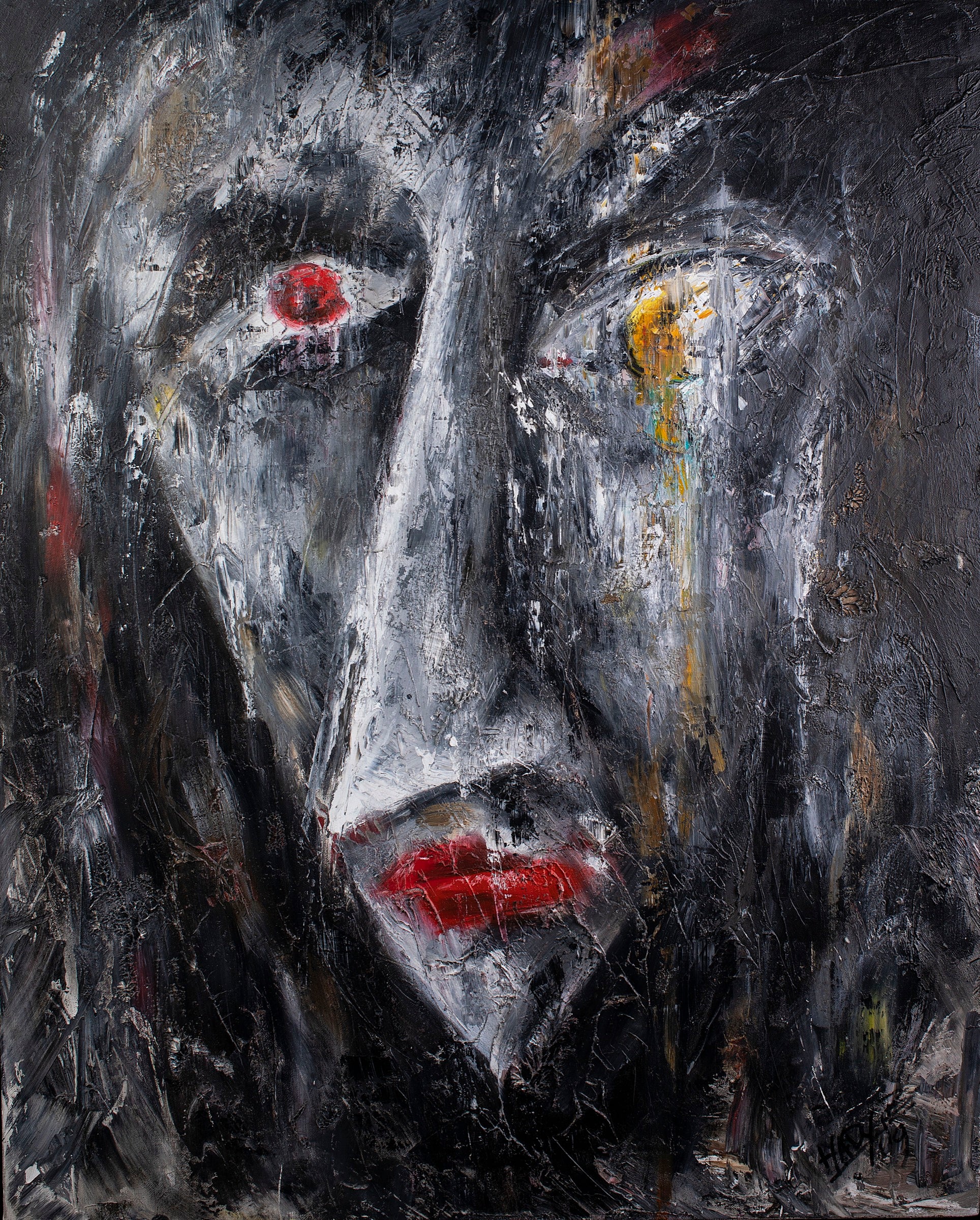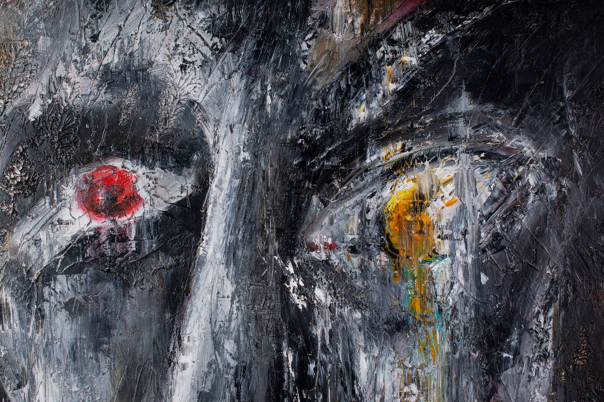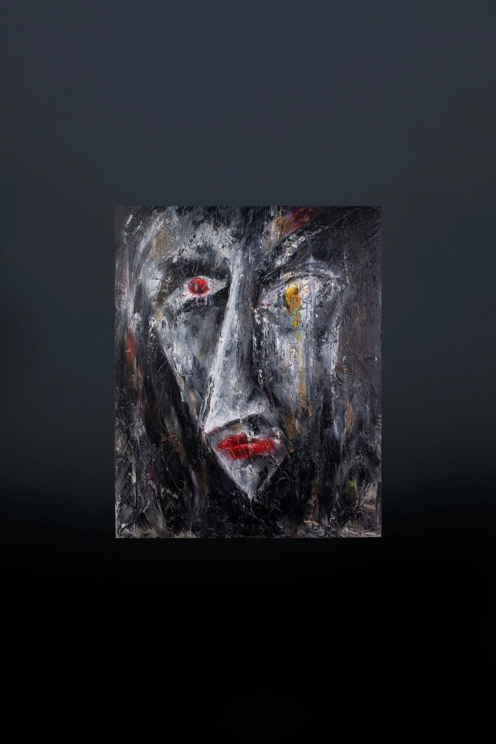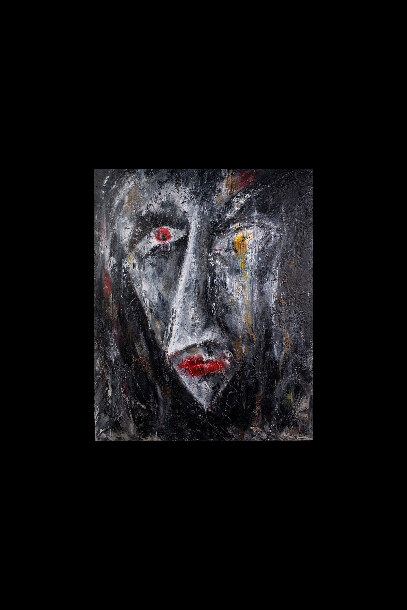 The face emerges from darkness with eyes that no longer search yet still witness.