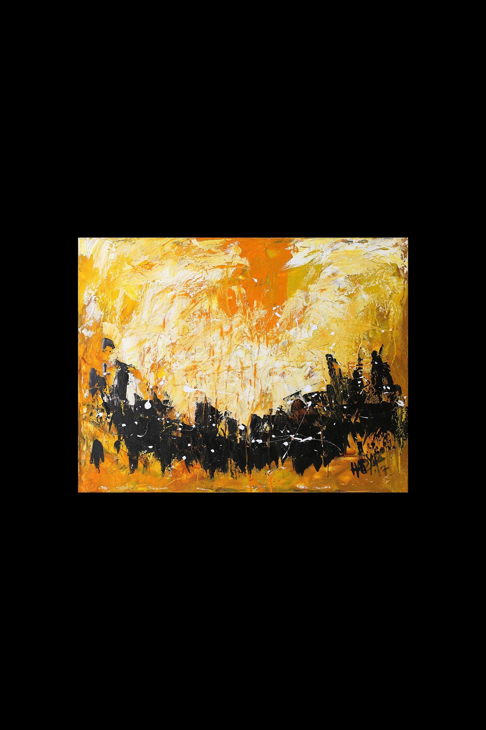 Desert Run captures movement through heat and silence. Black forms cut across a burning yellow field like shadows in motion, suggesting figures, ruins, or a fleeting horizon line. The surface feels restless yet grounded, as if something is crossing the landscape fast, driven by instinct rather than destination. It holds tension between urgency and vast stillness.