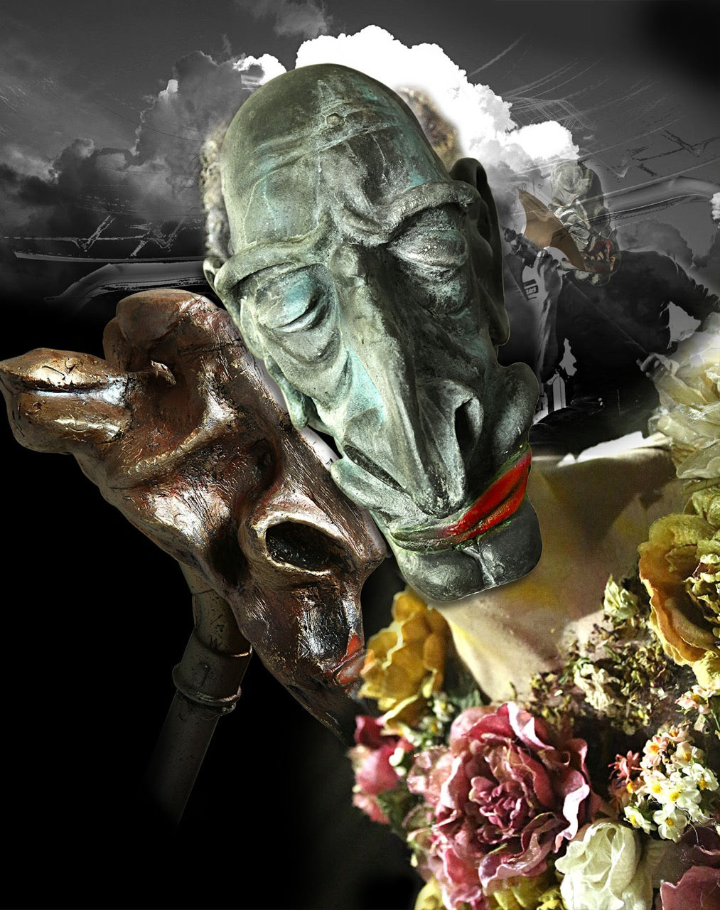 A COLLISION OF SCULPTURE, PHOTOGRAPHY, AND DIGITAL MANIPULATION. THIS WORK IS CONSTRUCTED FROM ORIGINAL IMAGES OF BRONZE SCULPTURES FROM THE FAMILLIA SERIES, LAYERED WITH PHOTOGRAPHIC ELEMENTS AND REASSEMBLED THROUGH DIGITAL COLLAGE.