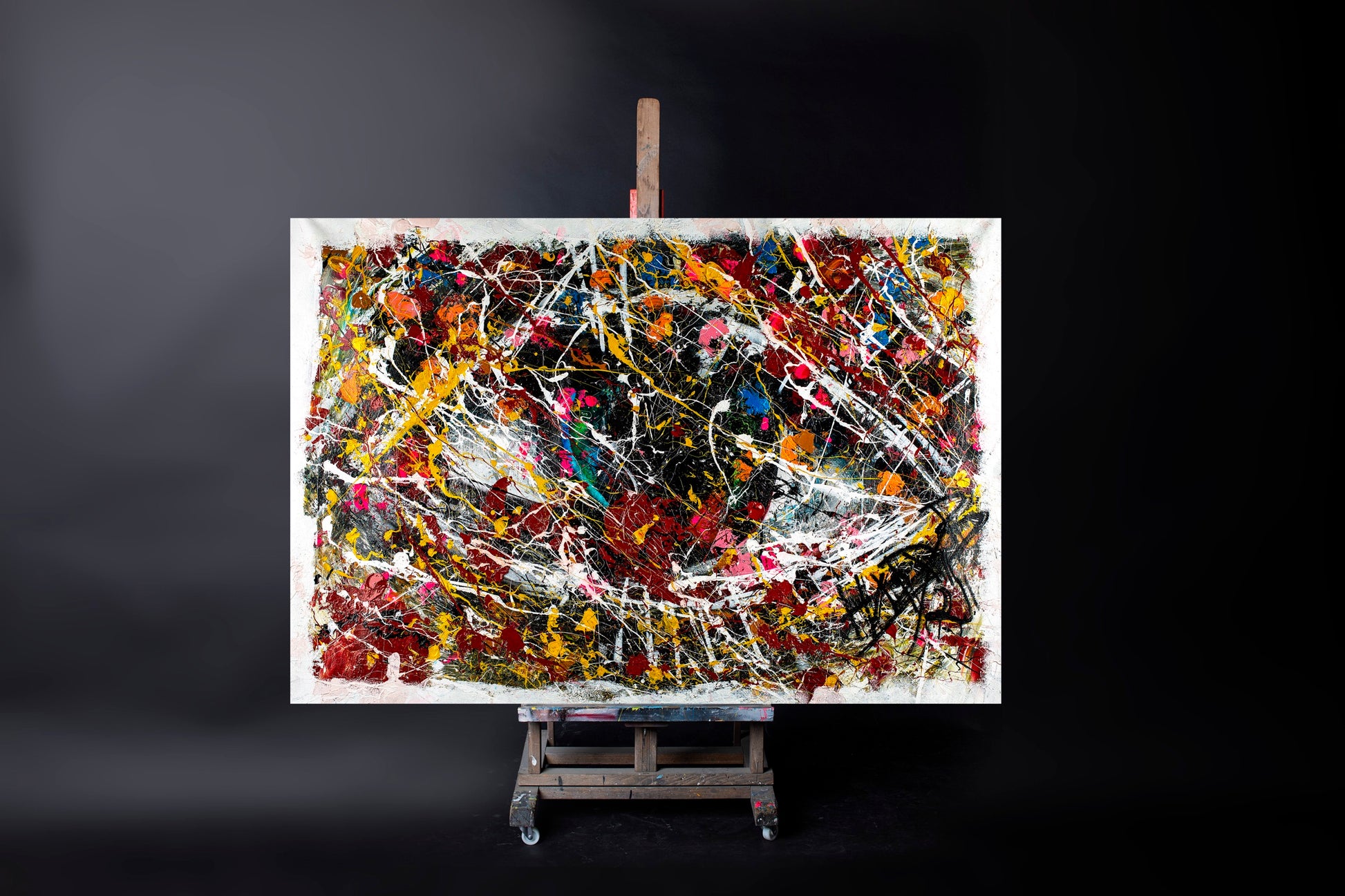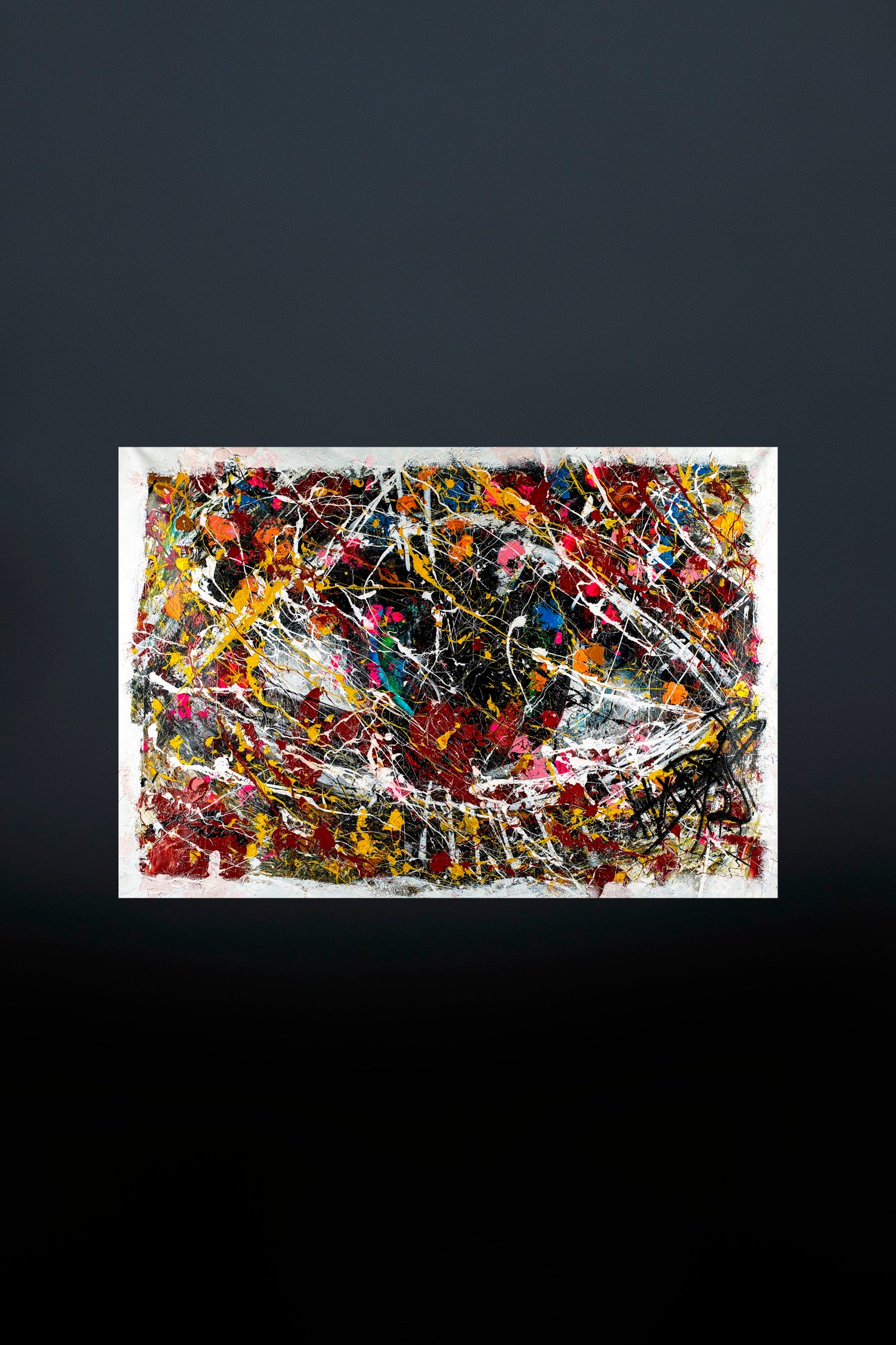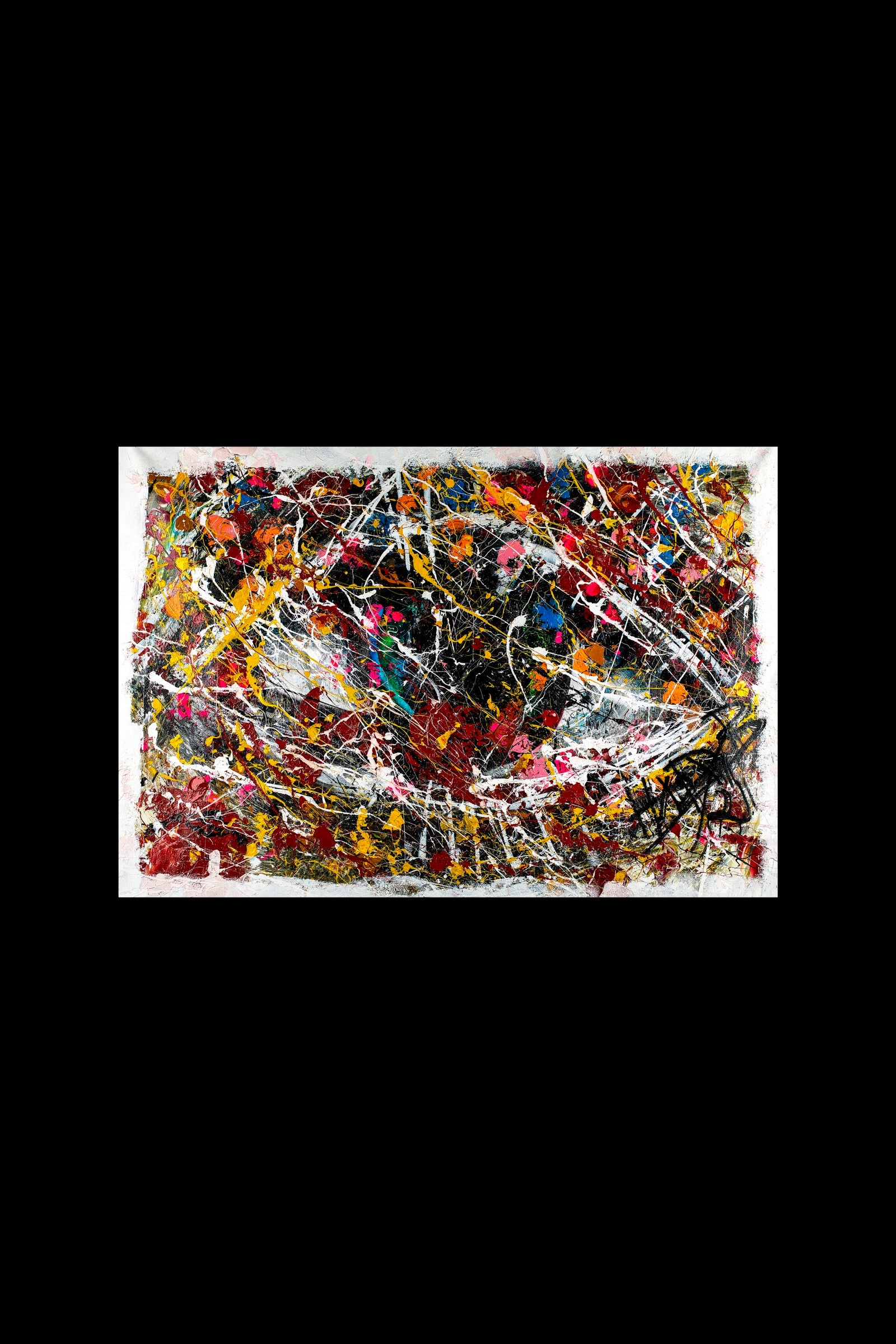 A suspended center surrounded by violent movement, splashes, collisions, and fractured color.
