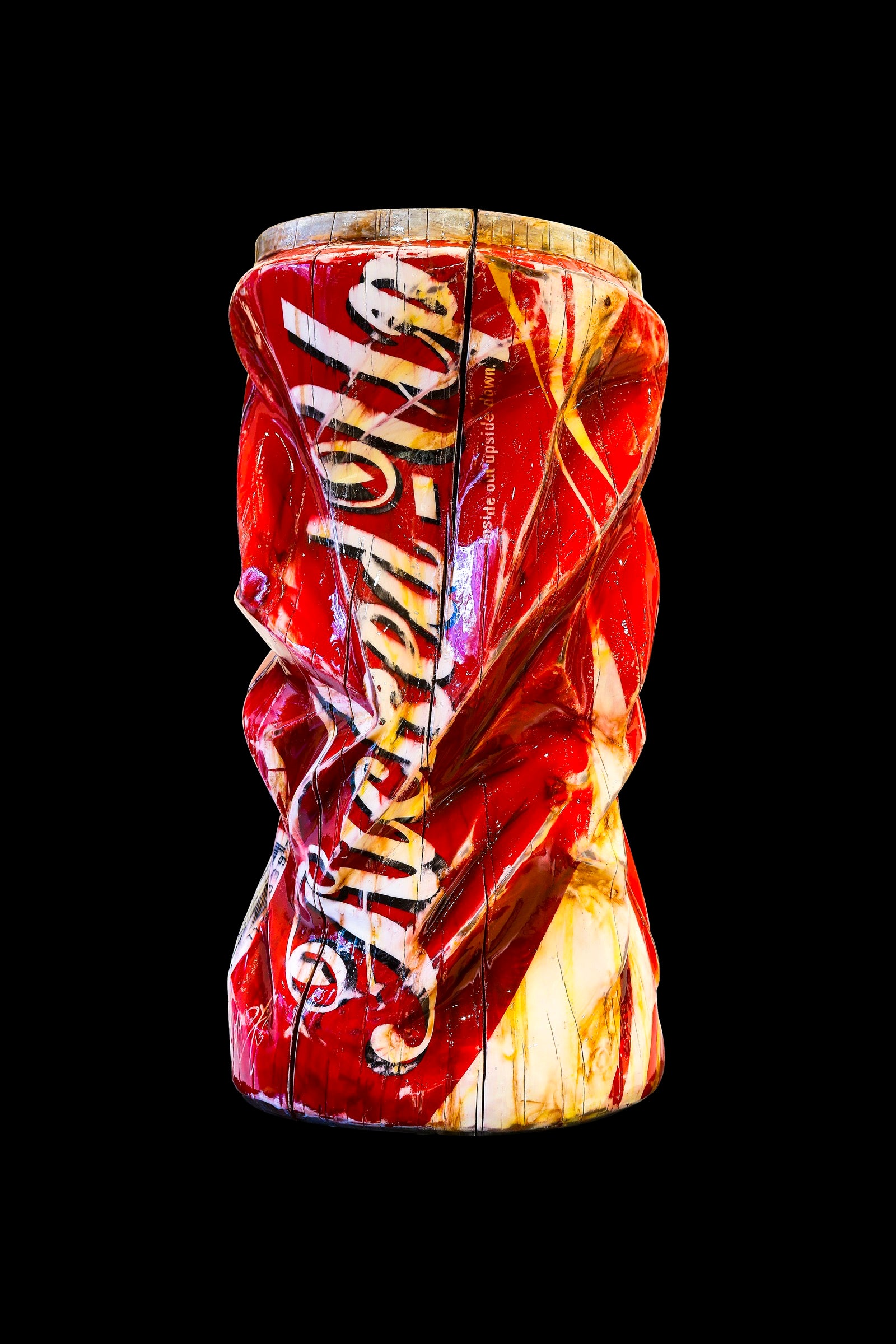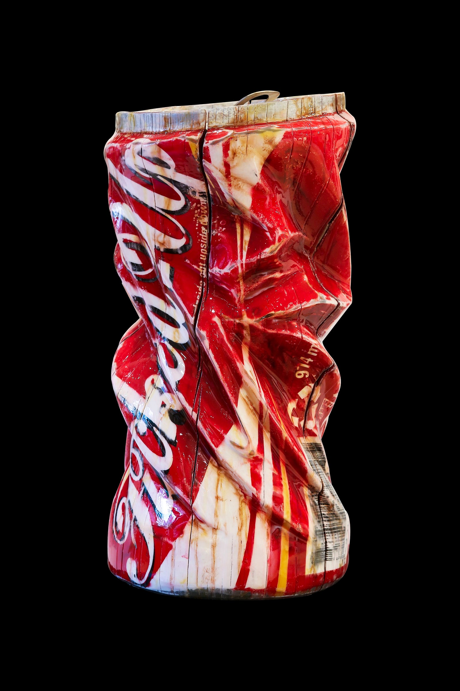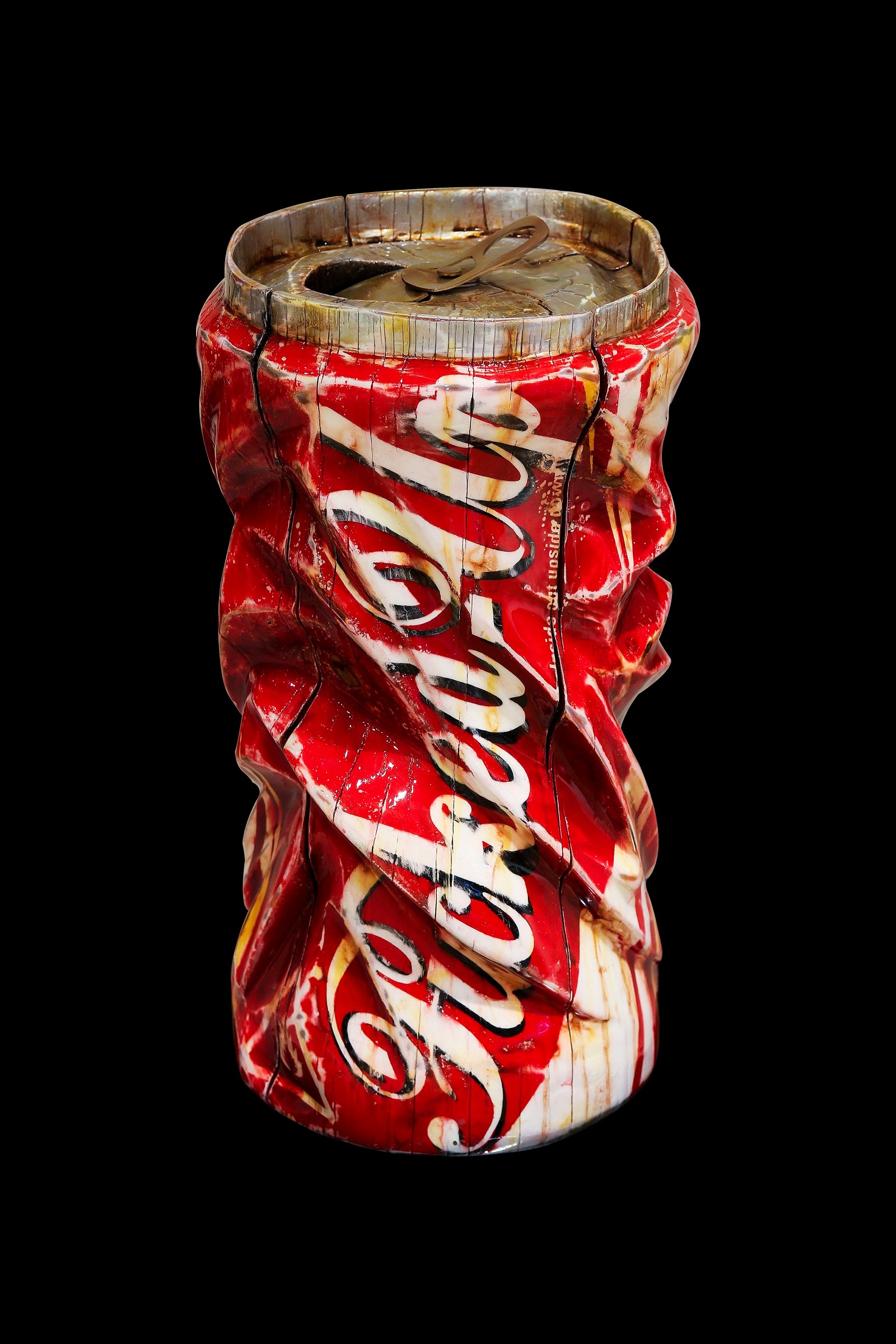 A striking wood sculpture that reimagines the iconic Coca-Cola form in a deliberately distorted state. The crumpled, bent silhouette evokes themes of emotional turmoil and psychological fragility, transforming a symbol of mass consumption into a raw commentary on inner struggle. Handcrafted from wood, this piece challenges viewers to confront the contrast between commercial perfection and human vulnerability. A powerful statement artwork for collectors drawn to conceptual and socially conscious sculpture.