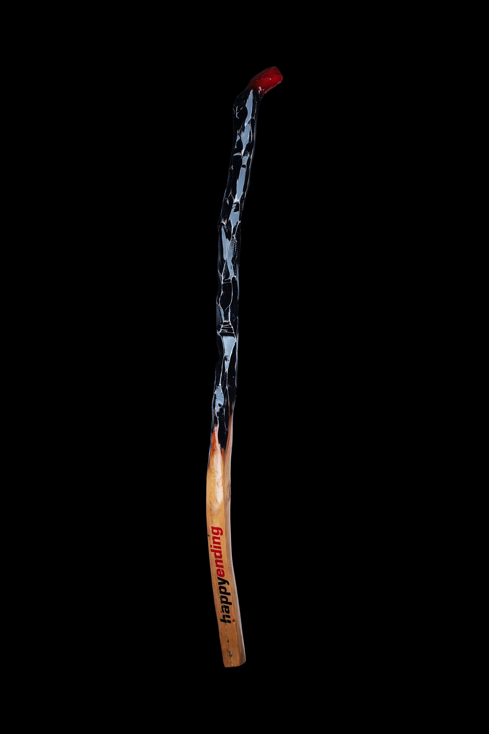 A charming wood sculpture featuring a burnt out matchstick with "HAPPY ENDING" written on it as a clever visual pun that brings wit and warmth to any space. Perfect for art lovers who appreciate playful humor and craftsmanship. This unique piece makes a memorable conversation starter and a thoughtful gift for anyone who enjoys clever wordplay and contemporary art.