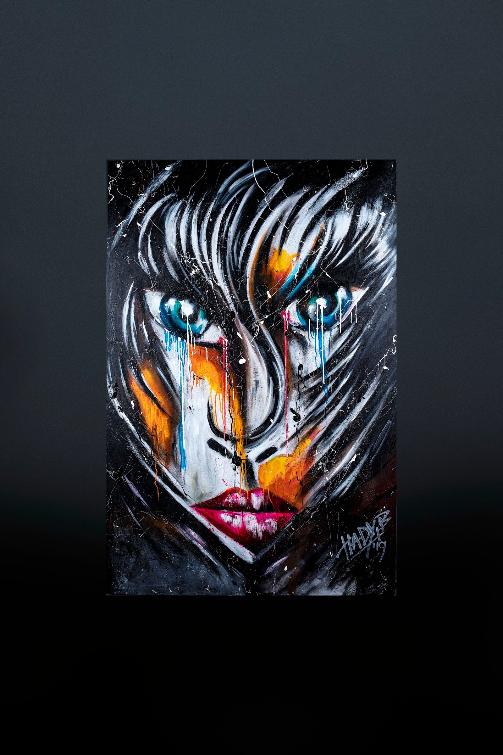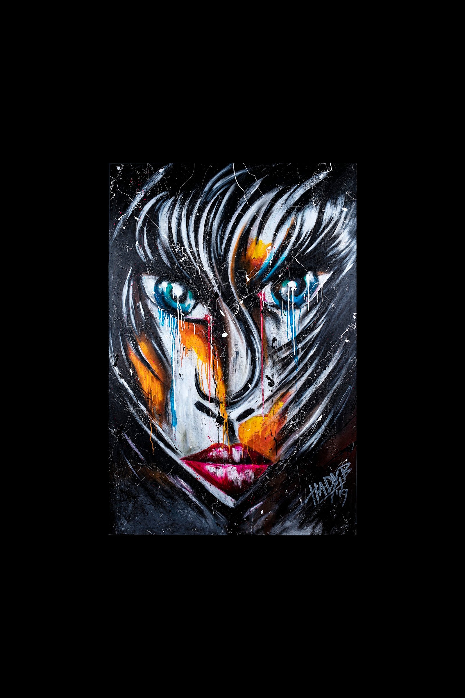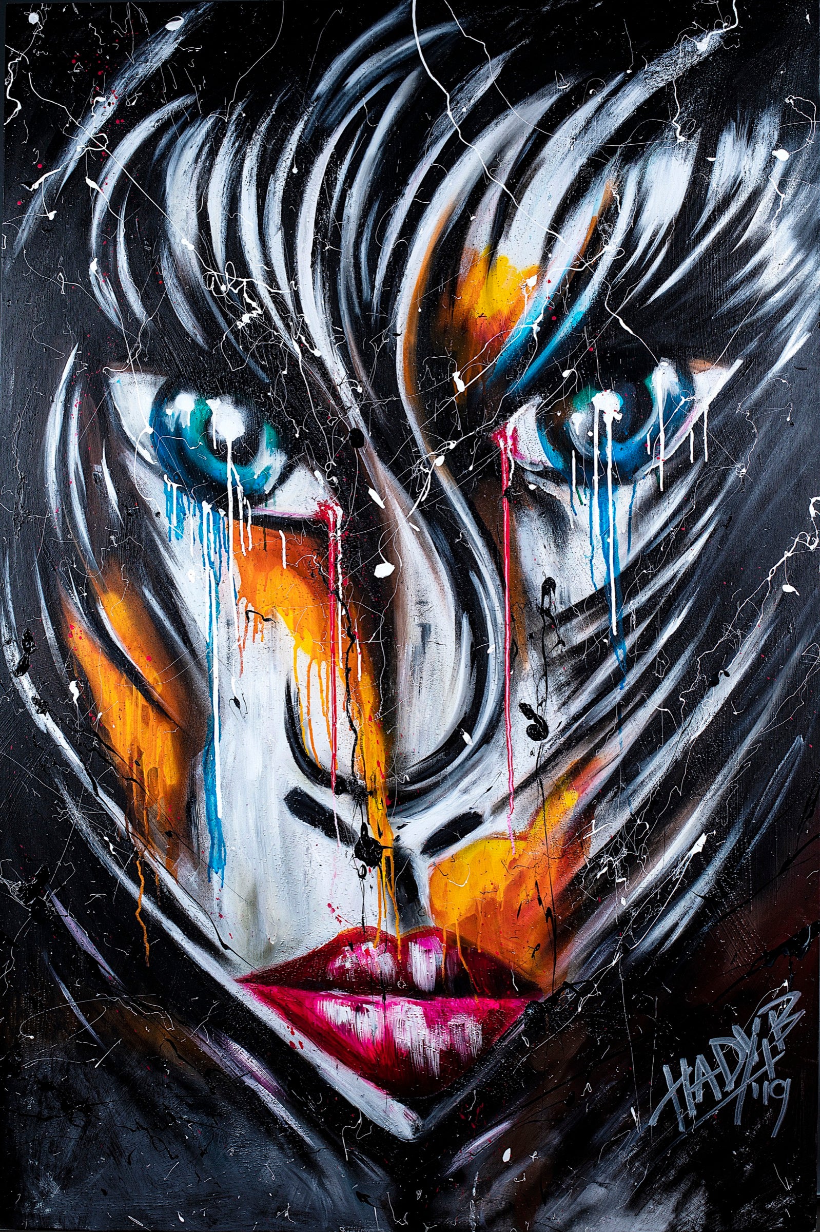The face performs rather than hides exposing vulnerability through intensity color and gesture.