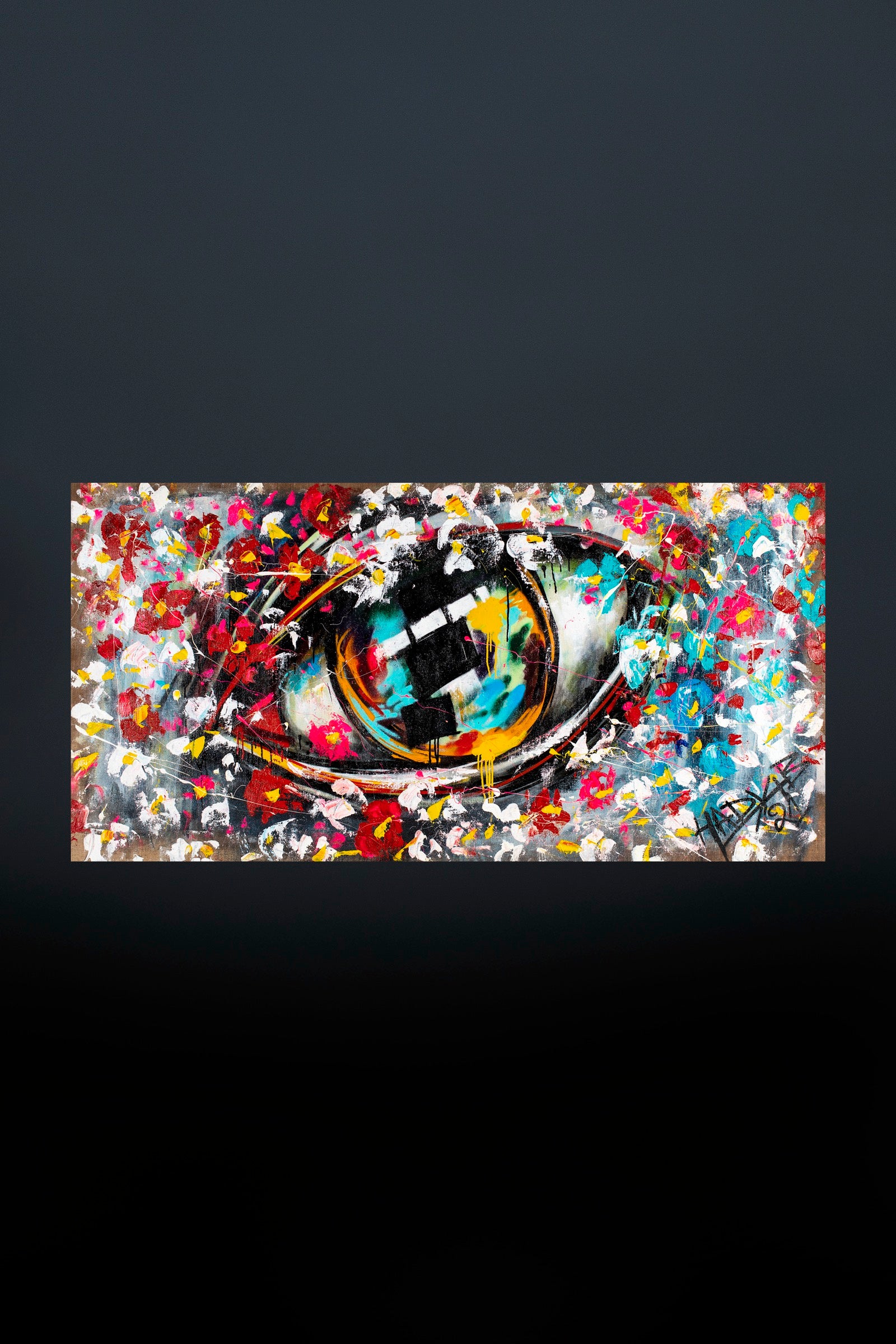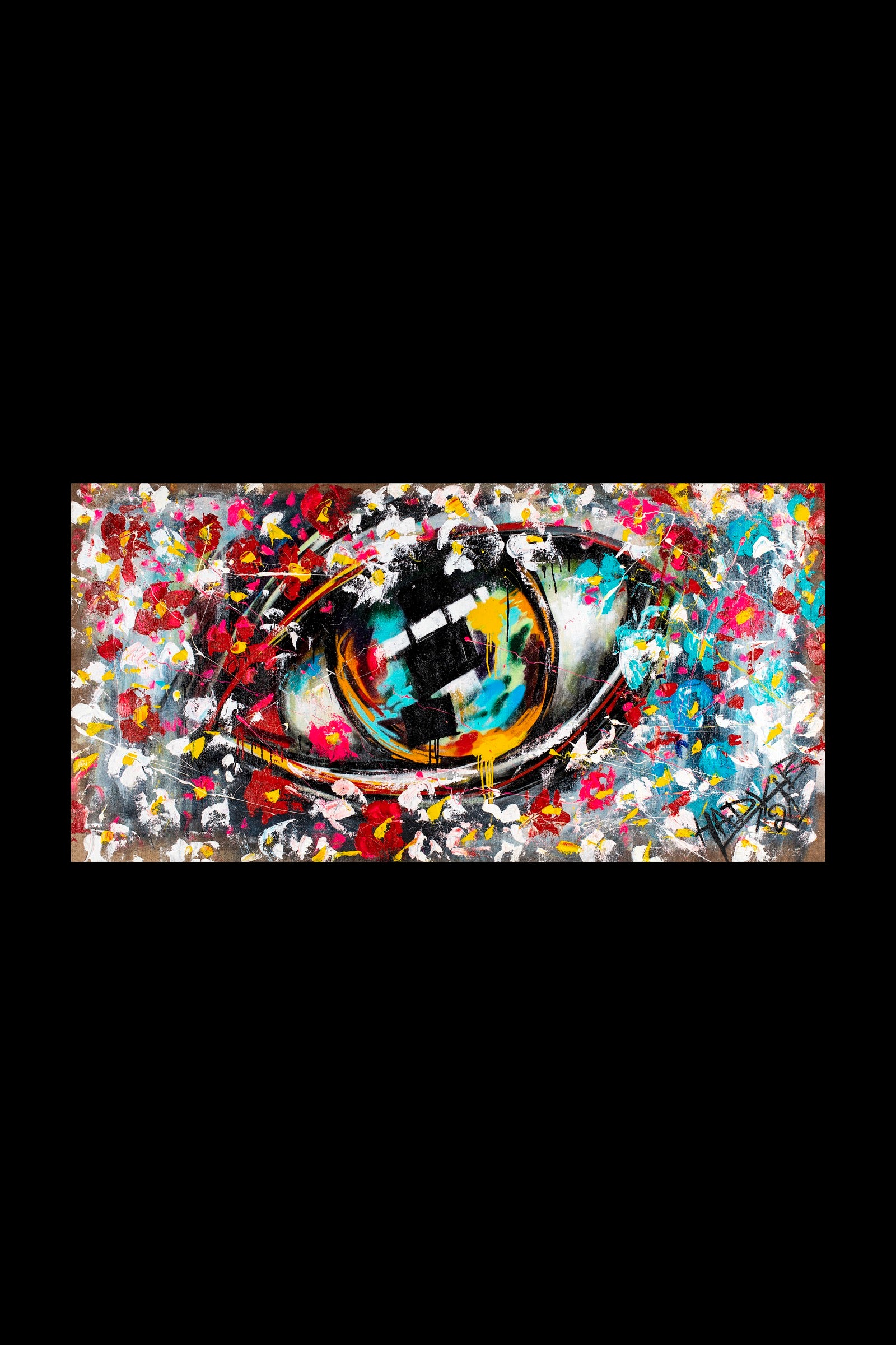 Fragments of color erupt around the pupil like debris after an internal explosion, suggesting that rebirth is never clean — it is layered, noisy, and earned.