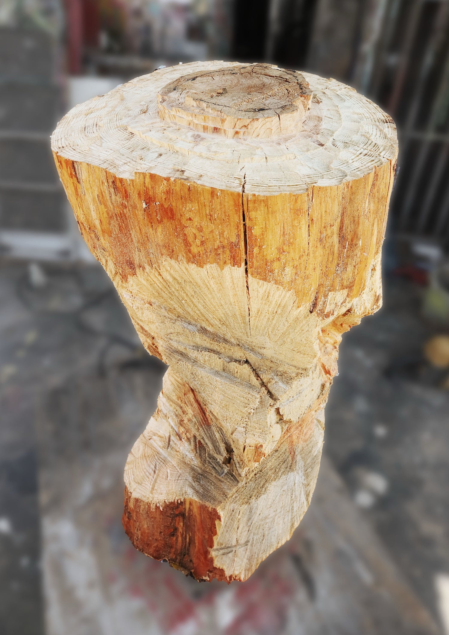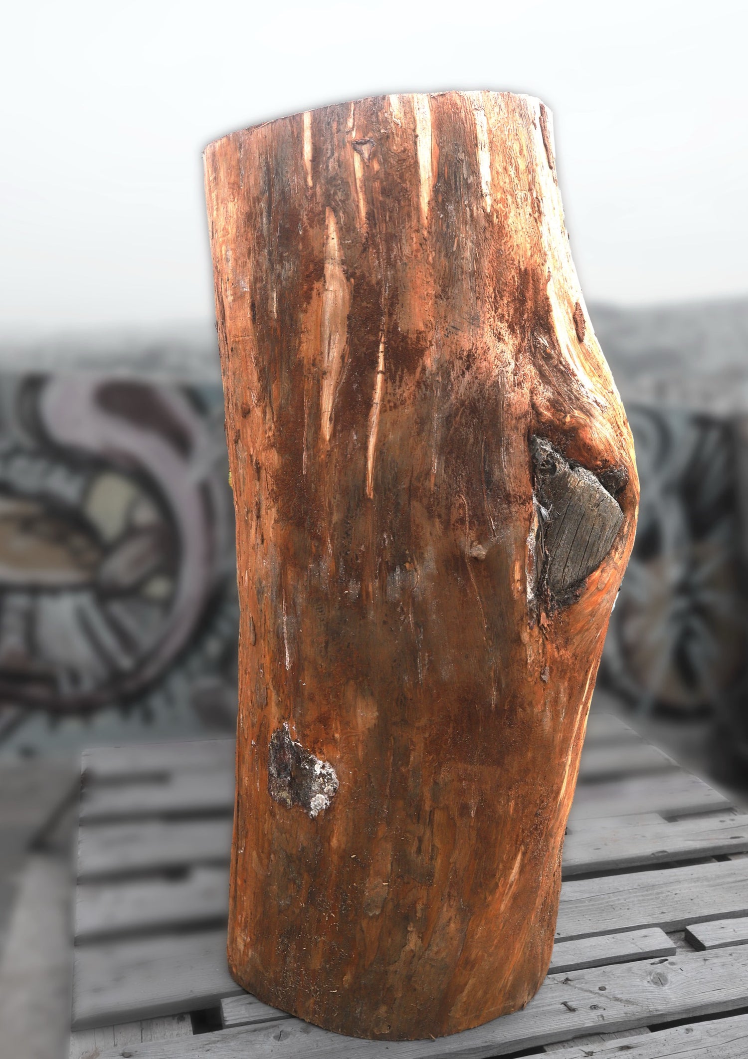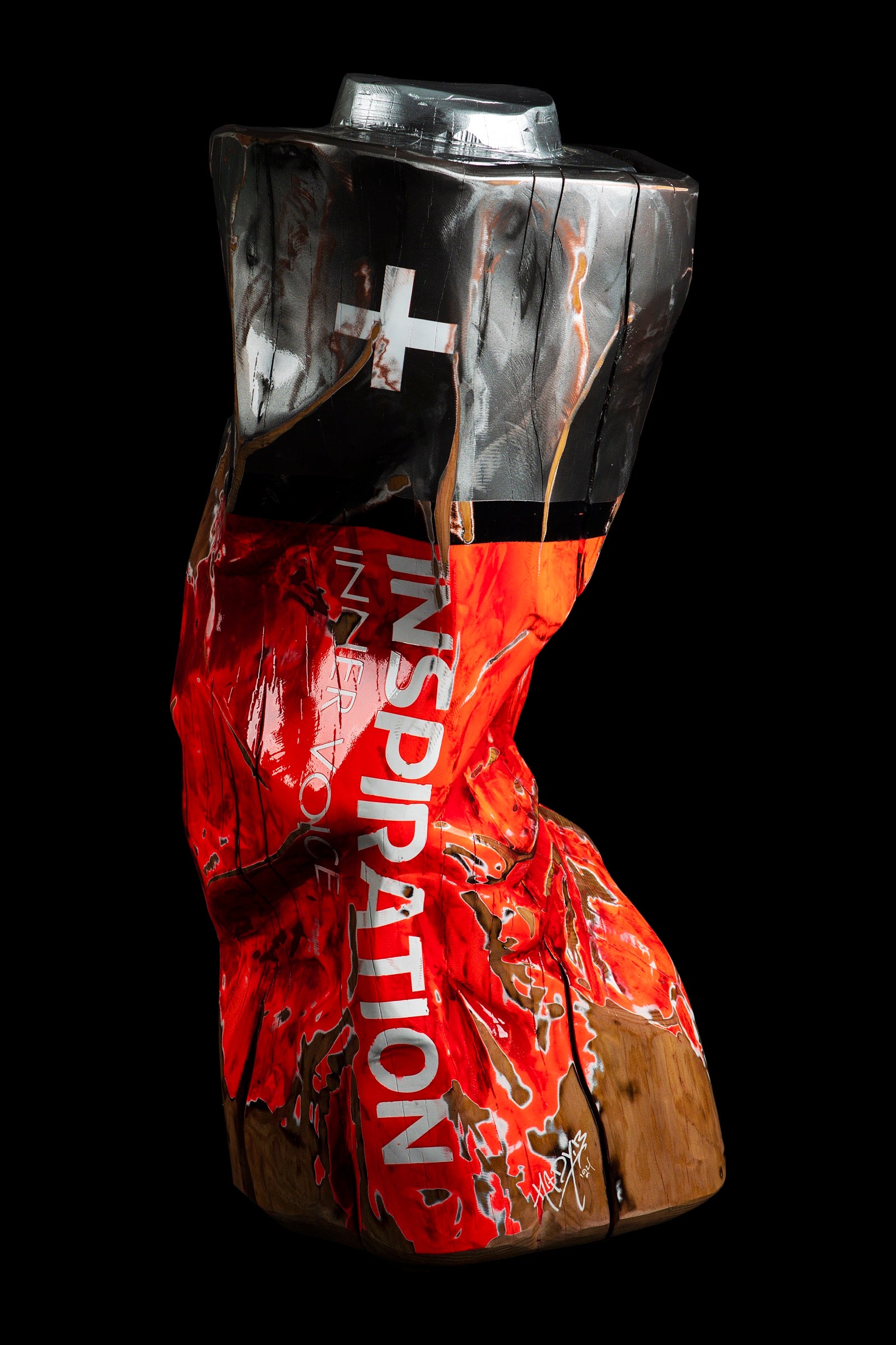 The use of pine wood in the sculpture evokes warmth, simplicity, and renewal. Known for its versatility and resilience, pine symbolizes strength and growth. The organic quality of the wood contrasts with the manufactured, synthetic appearance of a battery, highlighting the harmony between nature and human ingenuity. This blend of elements invites viewers to reflect on their relationship with the natural and the artificial.