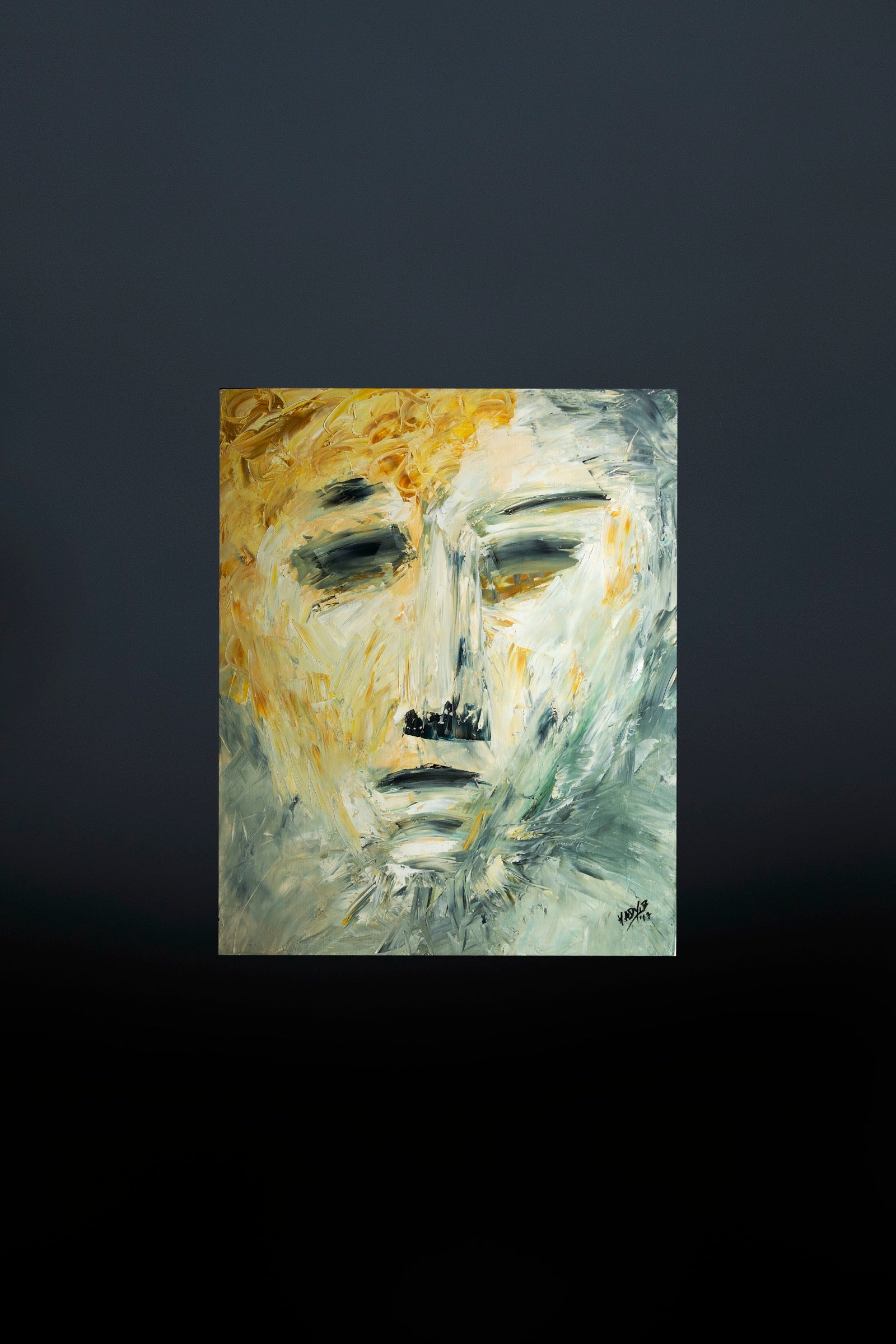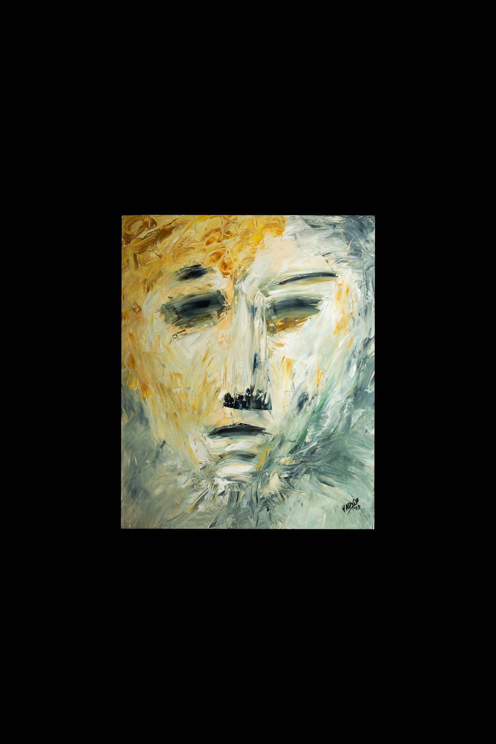 The face appears calm yet fractured, suspended between softness and restraint.