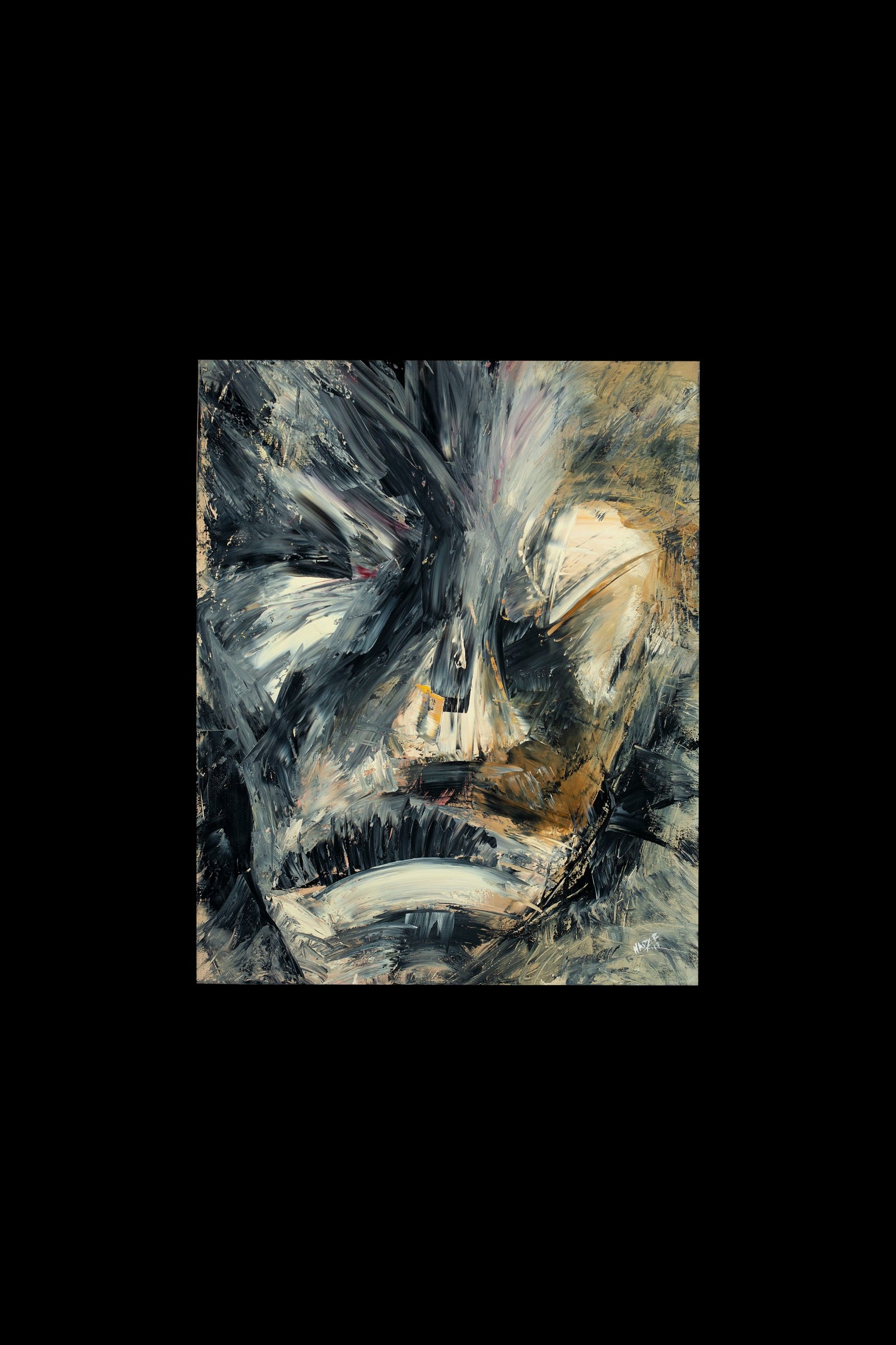 The face is split by force rather than symmetry, pulled between exposure and concealment.