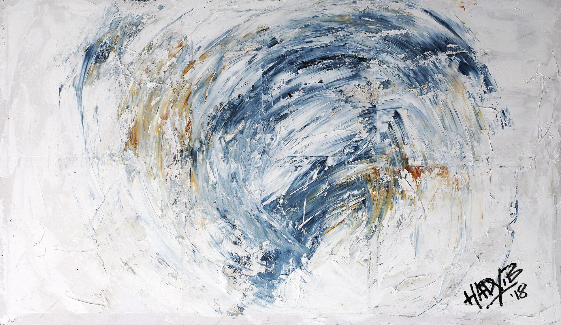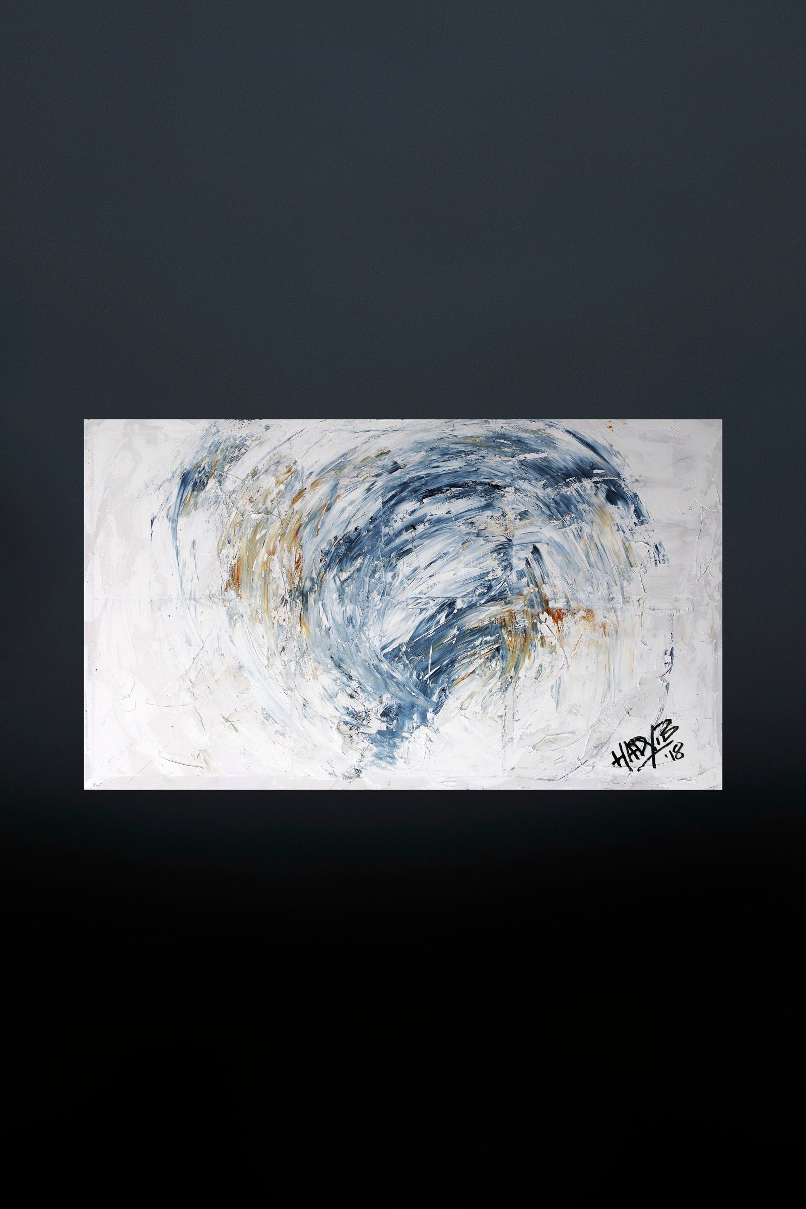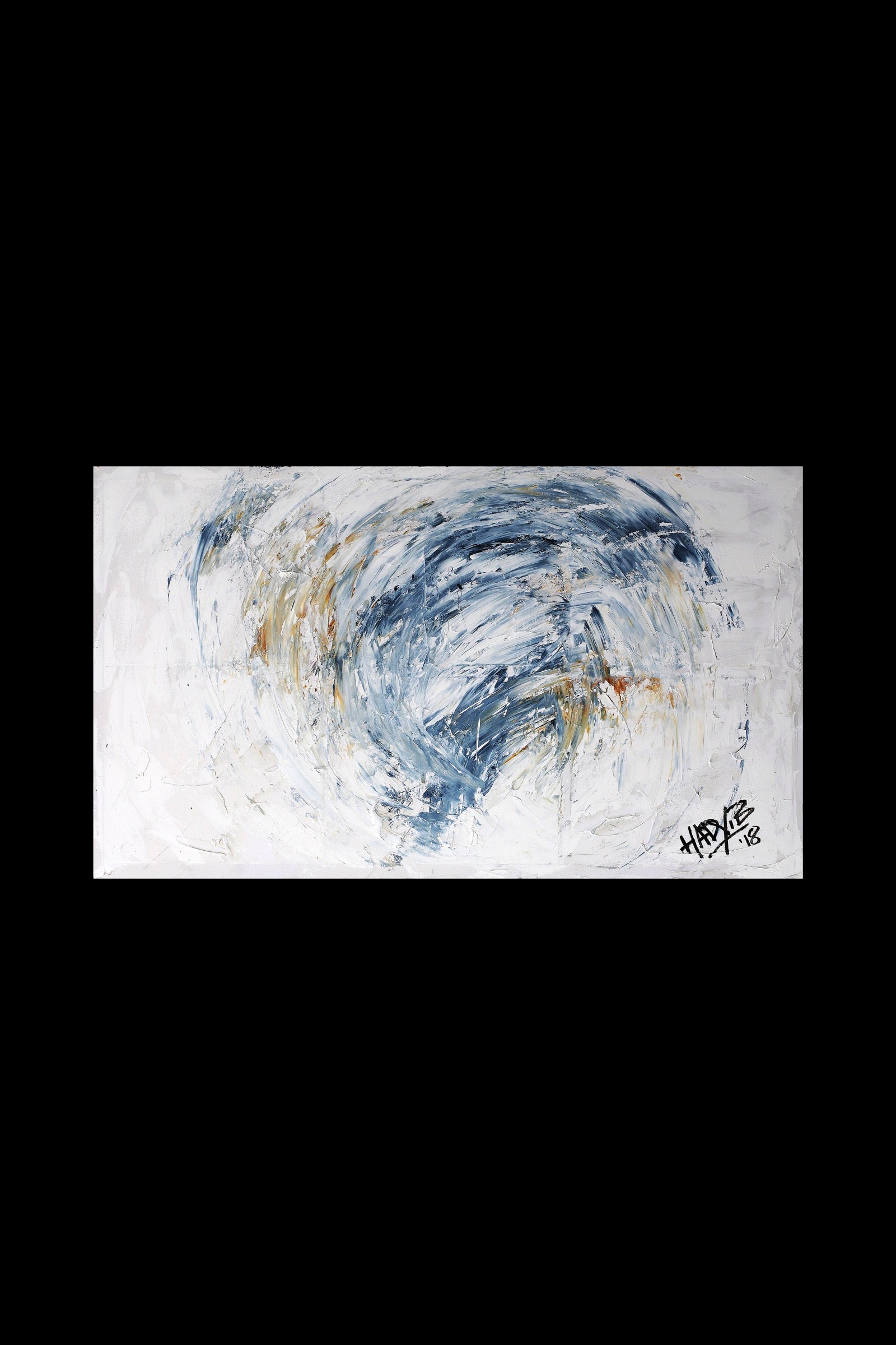 Moment of Peace is a pause suspended in motion. Soft blues and muted greys swirl gently across a white field, creating the sensation of breath after chaos. The movement is present but restrained, like water settling after a storm. This work speaks of clarity, silence, and the rare instant when the mind loosens its grip and allows stillness to surface.