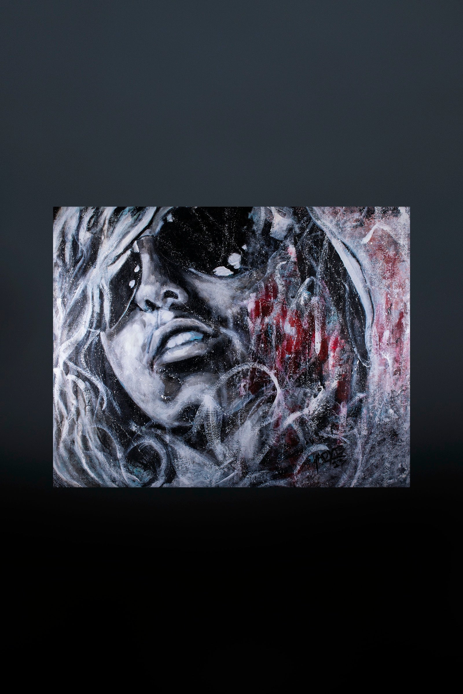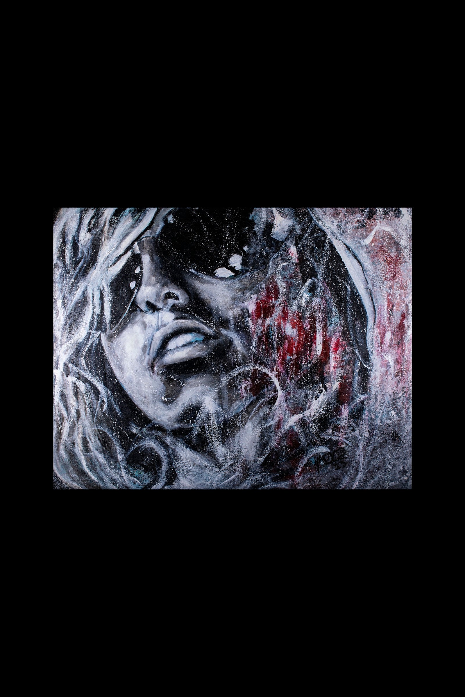 Noura is a portrait shaped by erosion rather than revelation. The face emerges through scraped layers, bruised whites, and restrained violence—half-visible, half-withheld. It carries weight, not beauty as decoration, but beauty as survival. This is not a gaze asking to be seen; it is a presence that remains even when obscured.