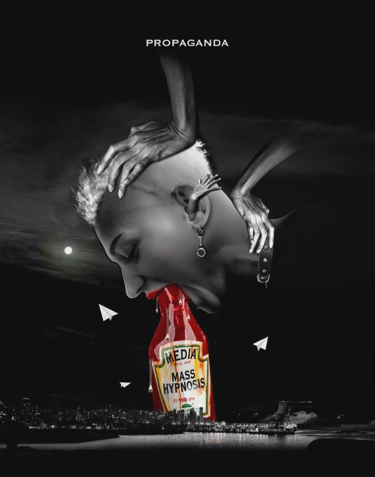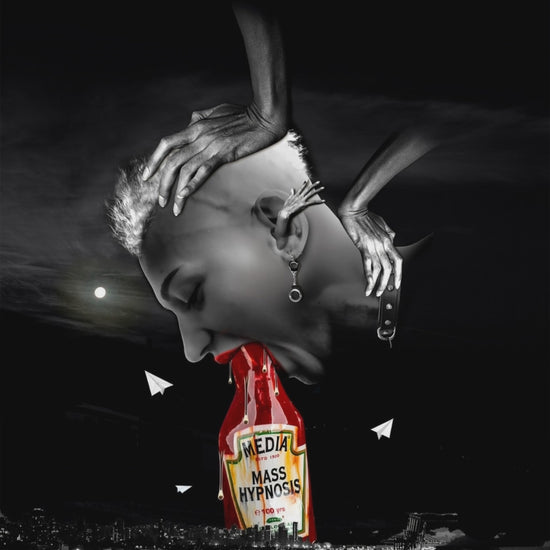 THIS WORK PORTRAYS PROPAGANDA AS COERCION, AN IDEA RAMMED DOWN THE THROAT UNTIL RESISTANCE COLLAPSES.