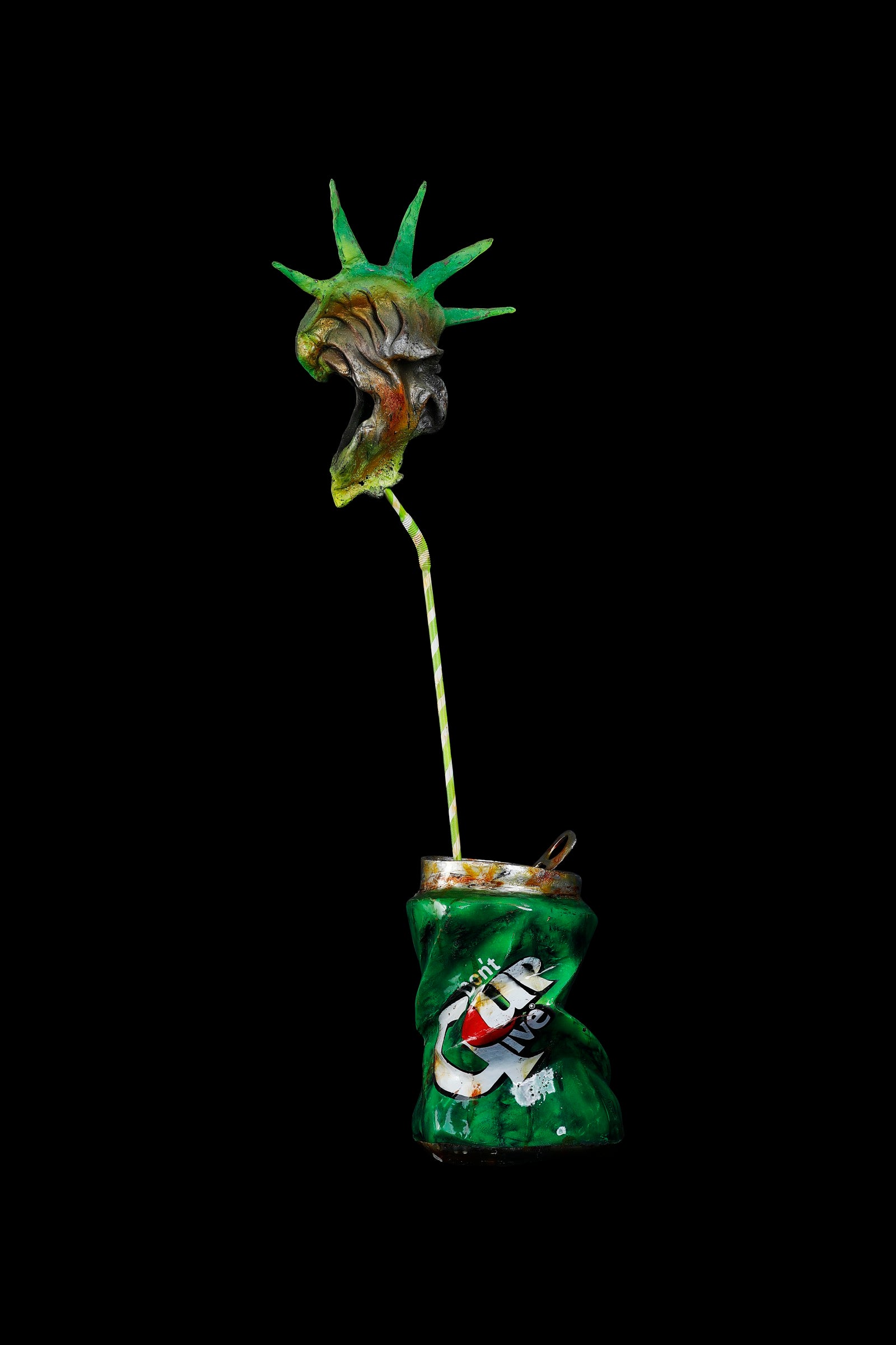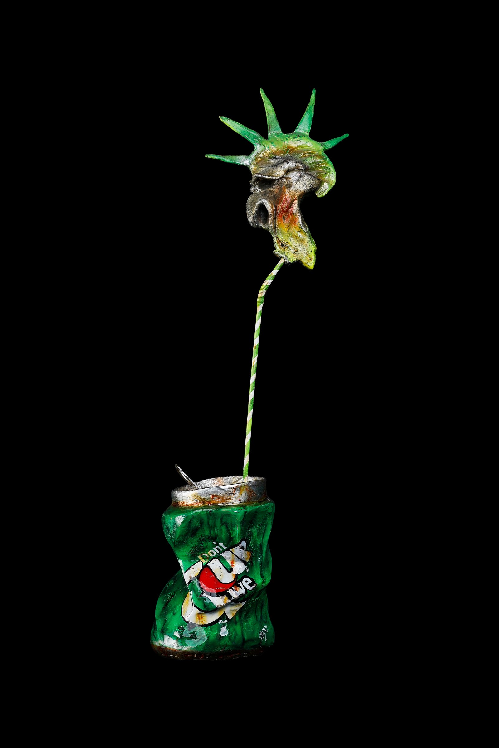 GREEN SPIKED HAIR AND A MASSIVE SODA CAN CARRY A MESSAGE OF RESILIENCE, EVEN AS DEFIANCE IS SOFTENED INTO CONSUMPTION.