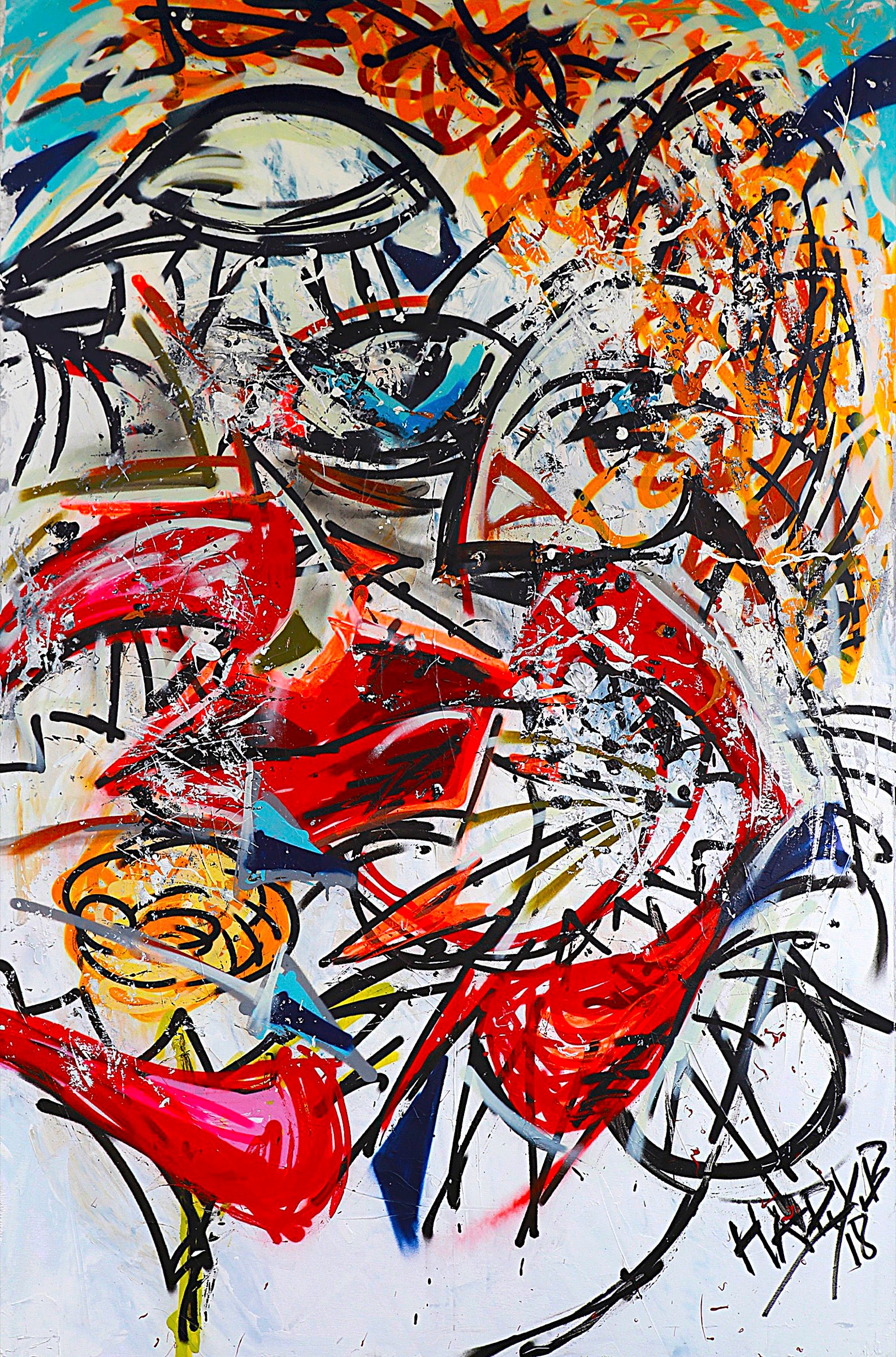 The face is no longer a stable structure but a collision of impulses marks and directions.