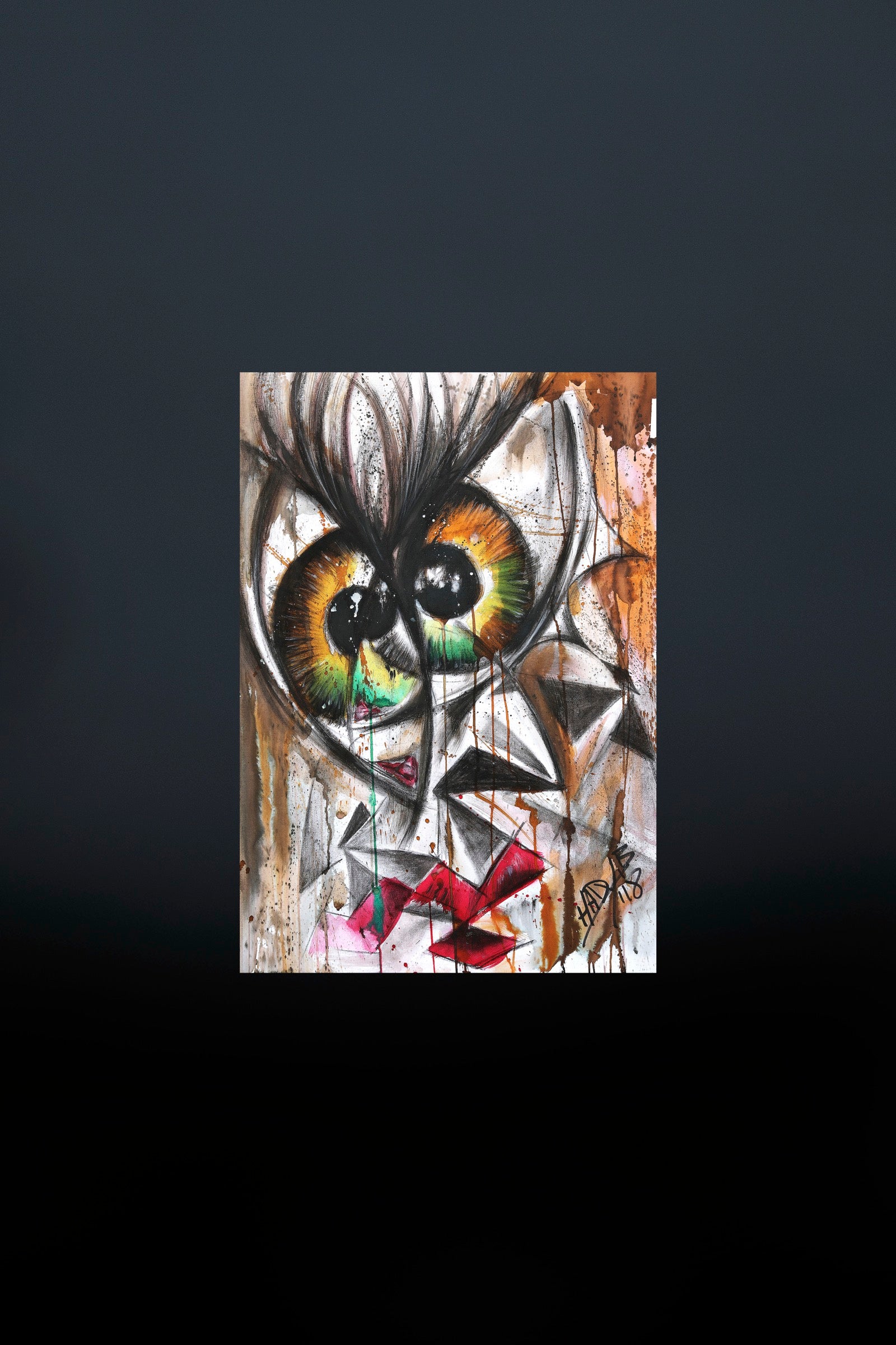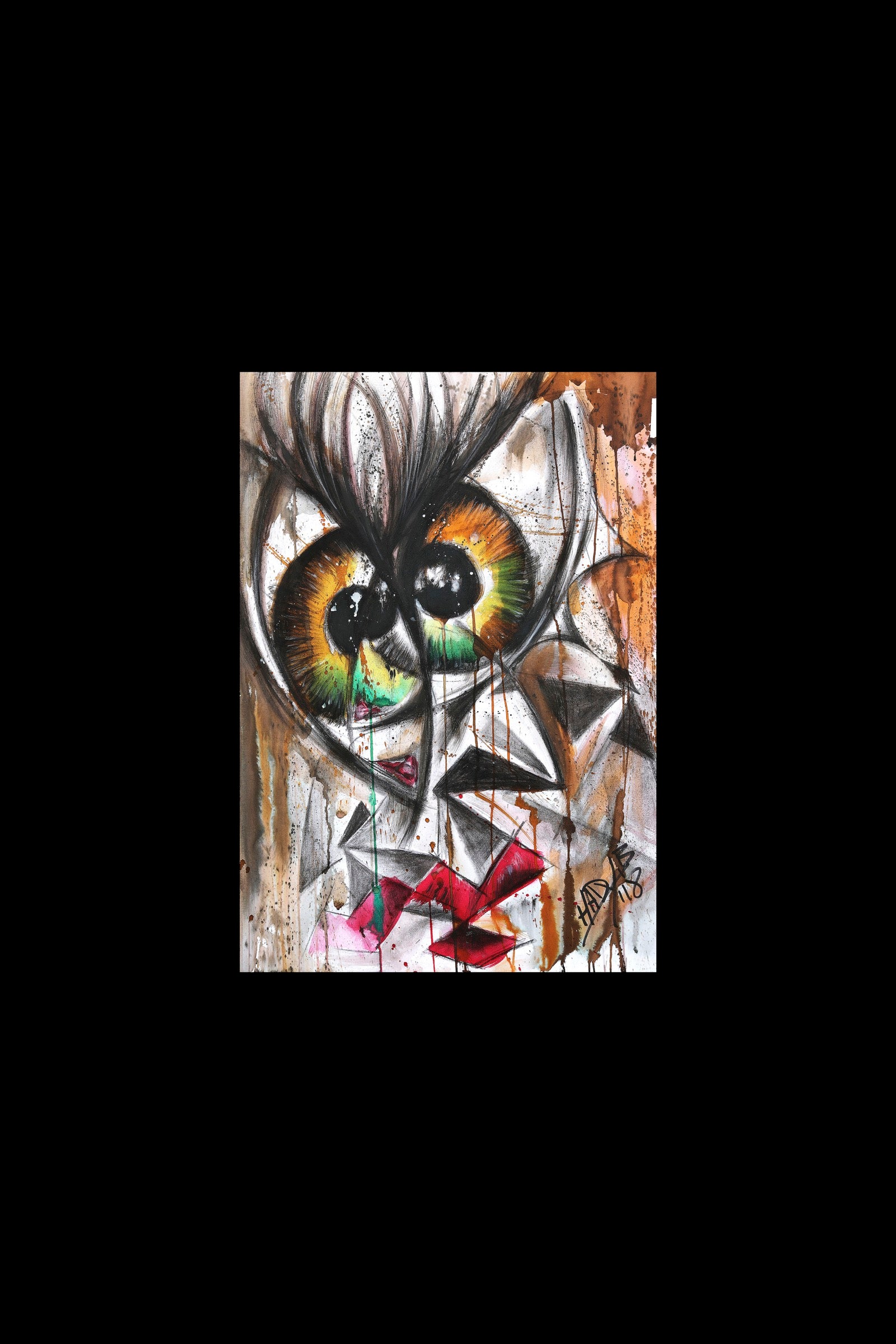 Self Talk is an internal dialogue made visible. The gaze feels split, turning inward, caught between reassurance and self doubt. Lines overlap like competing thoughts, while color leaks and stains the surface as emotion interrupts reason. The work holds that private moment when the mind speaks to itself too loudly, searching for clarity but circling the same questions.
