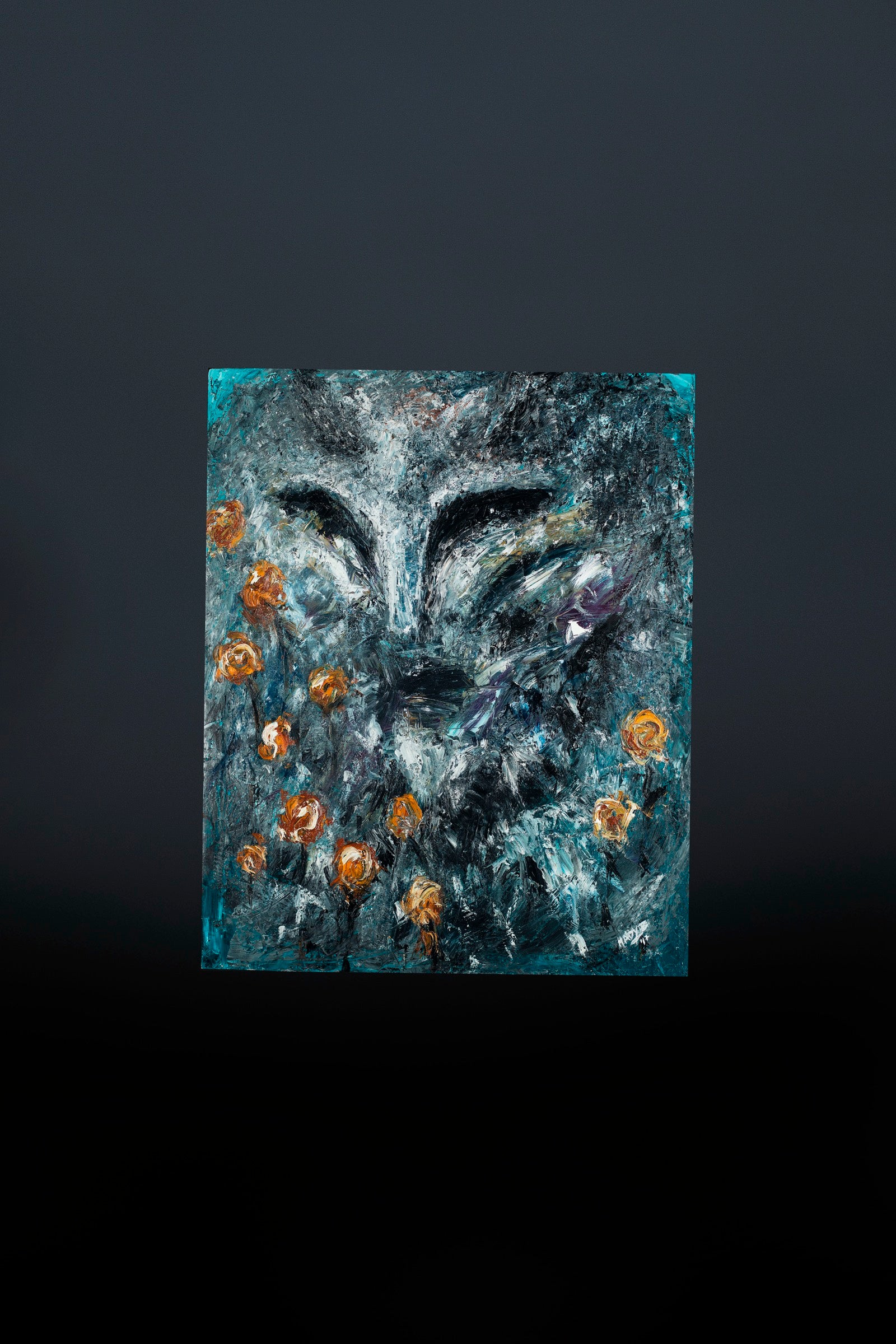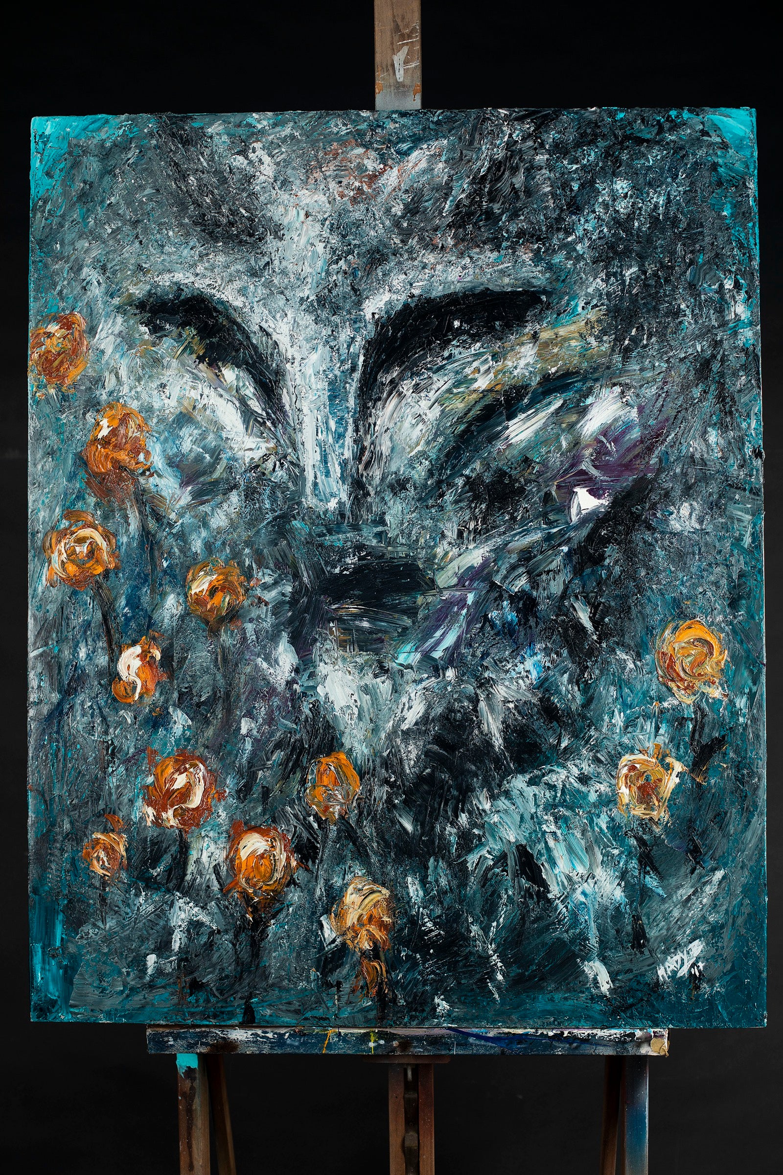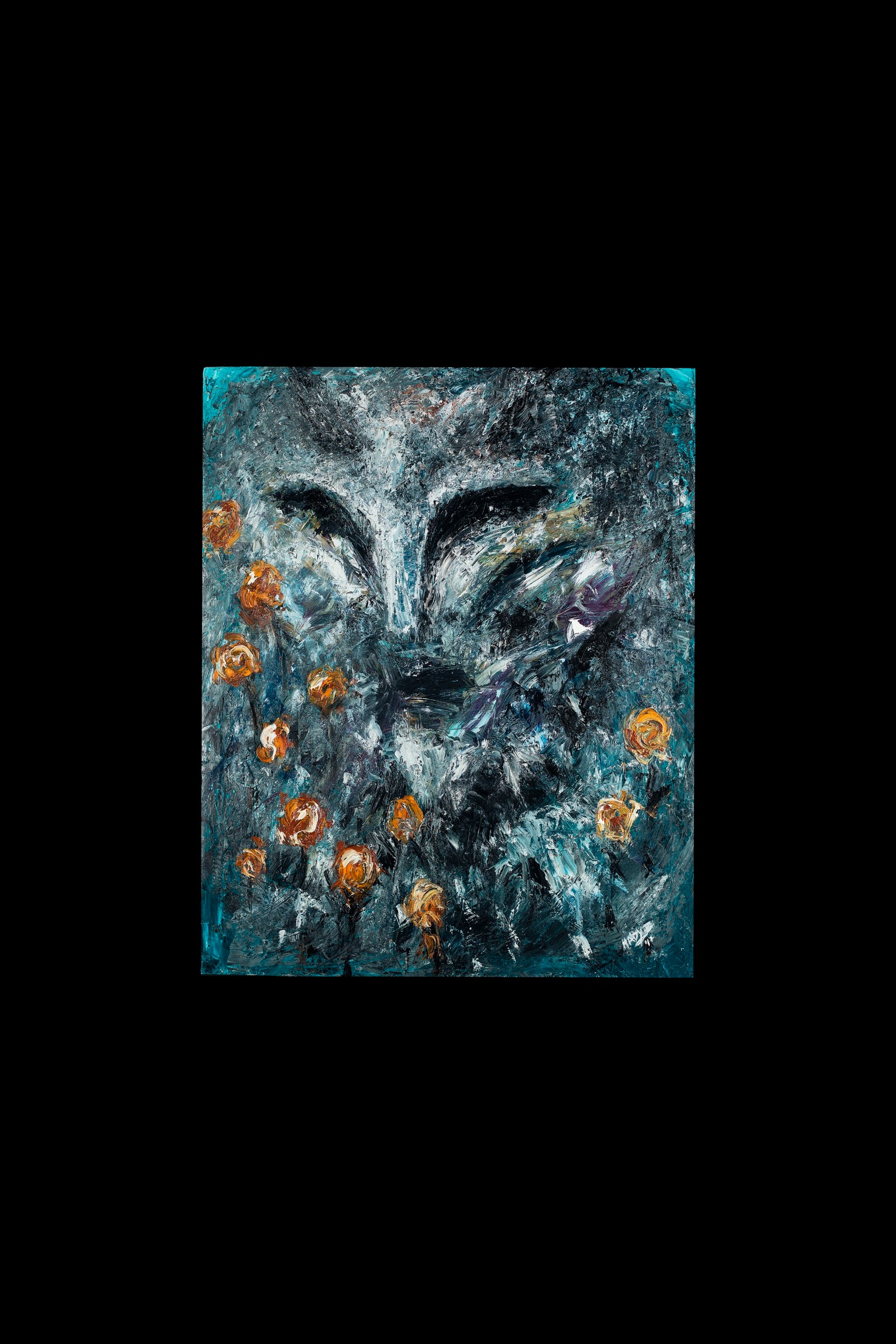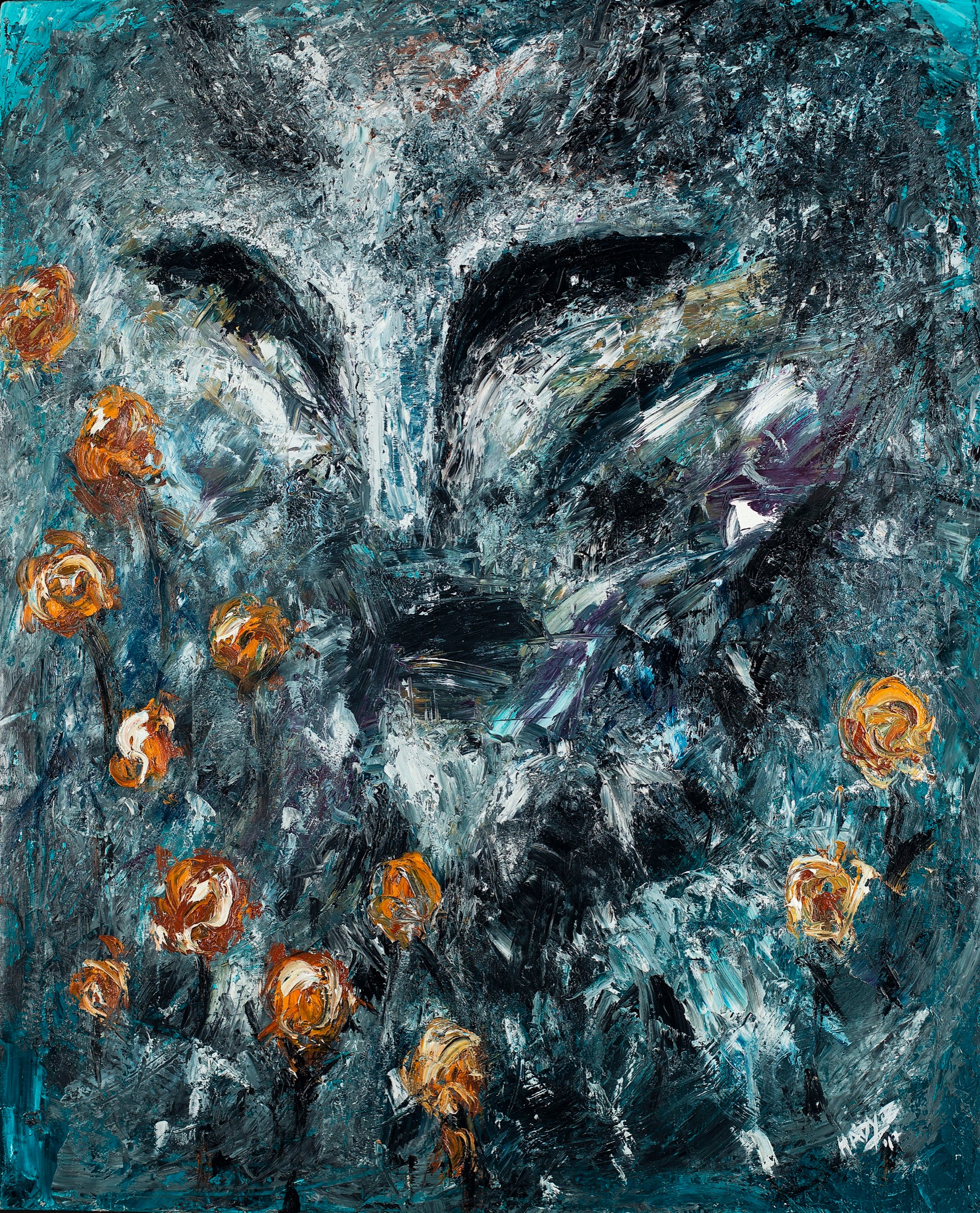 The face emerges from turbulence, not redeemed by beauty but surrounded by it.