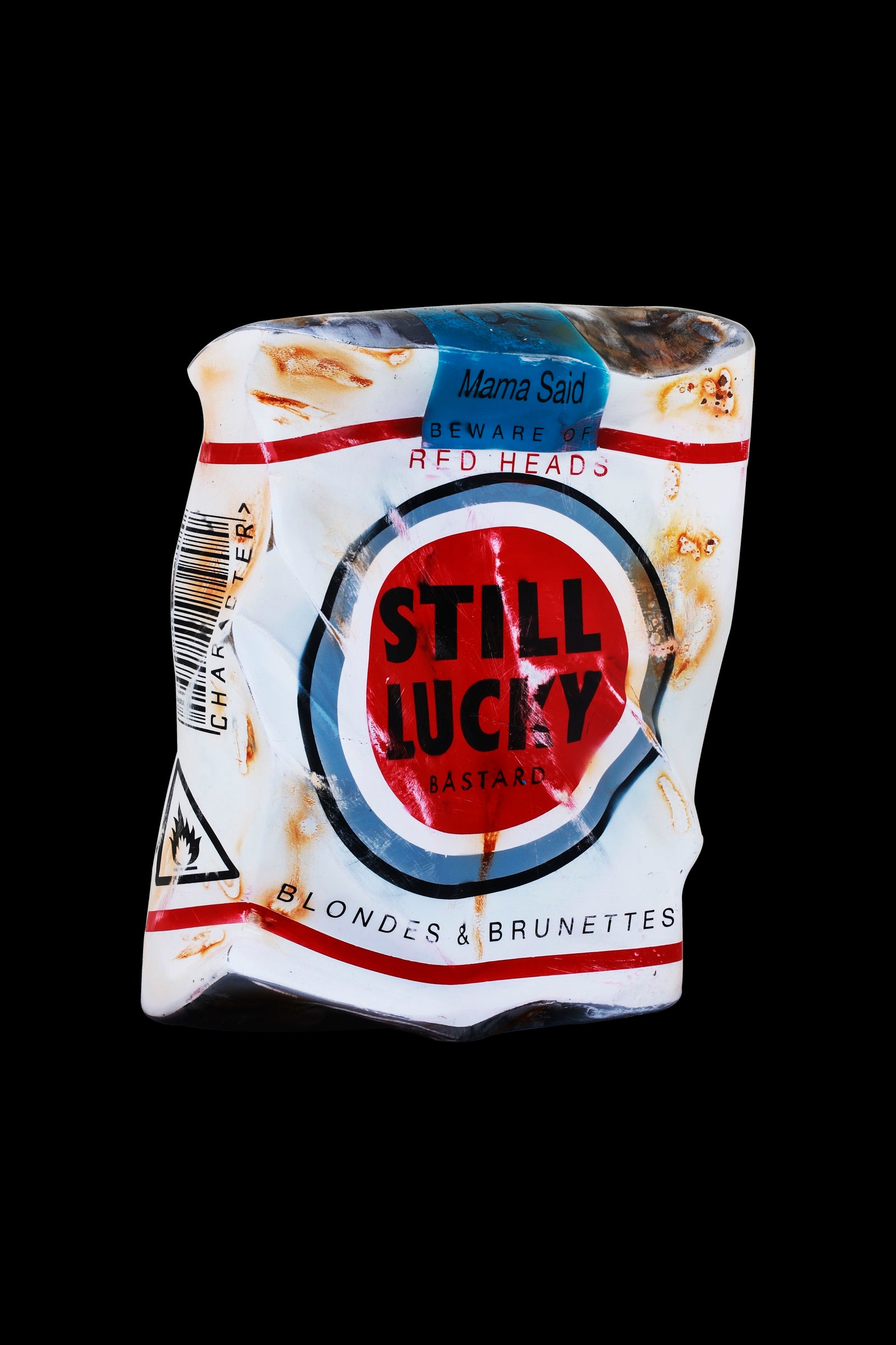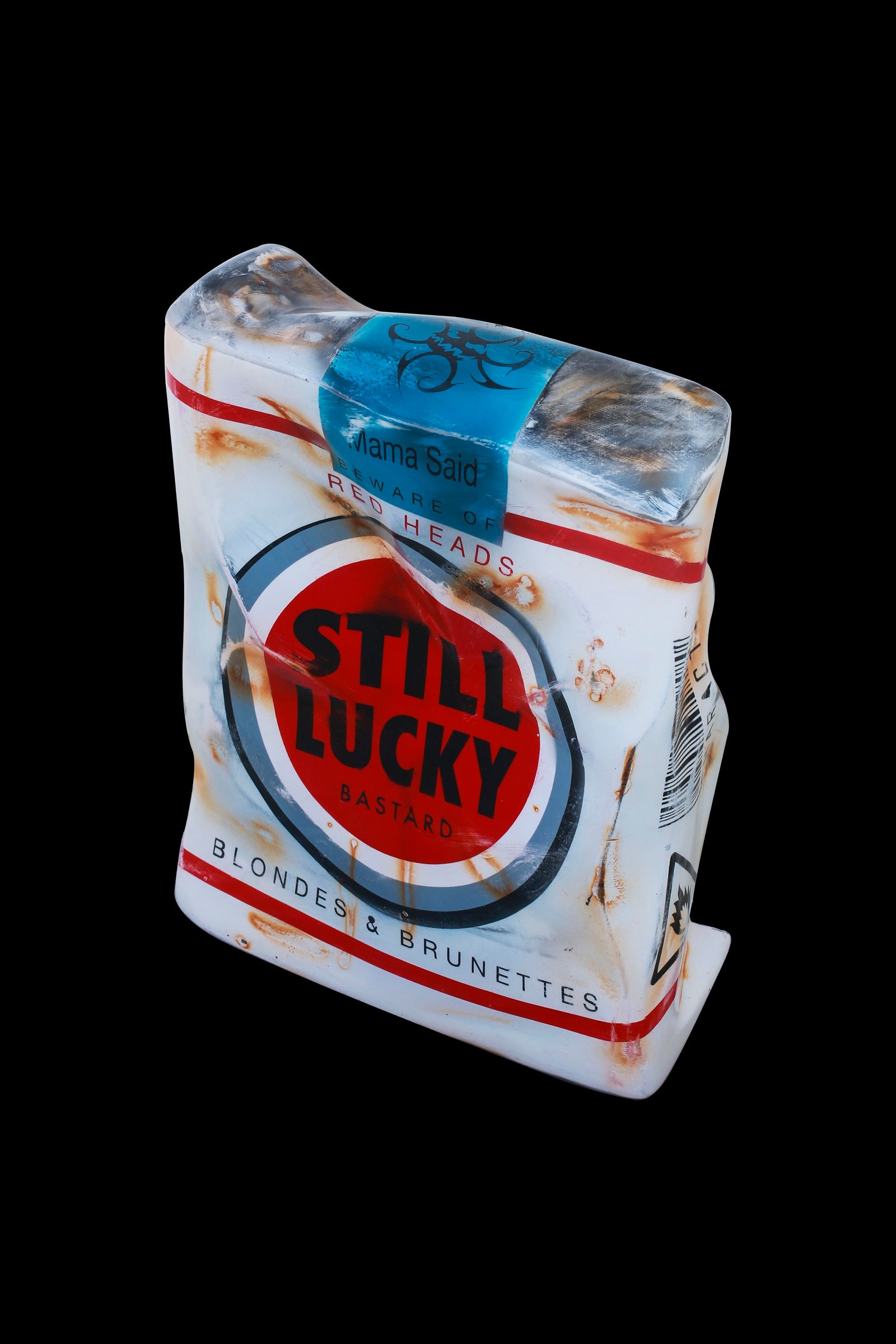 Reimagining the iconic Lucky Strike cigarette pack as "Still Lucky", a playful twist on nostalgia with an uplifting message. This unique art piece transforms a recognizable symbol into a statement of hope and humor, perfect for collectors of pop art, vintage enthusiasts, or anyone who appreciates clever conceptual design. A conversation starter that celebrates optimism through creative reinterpretation.