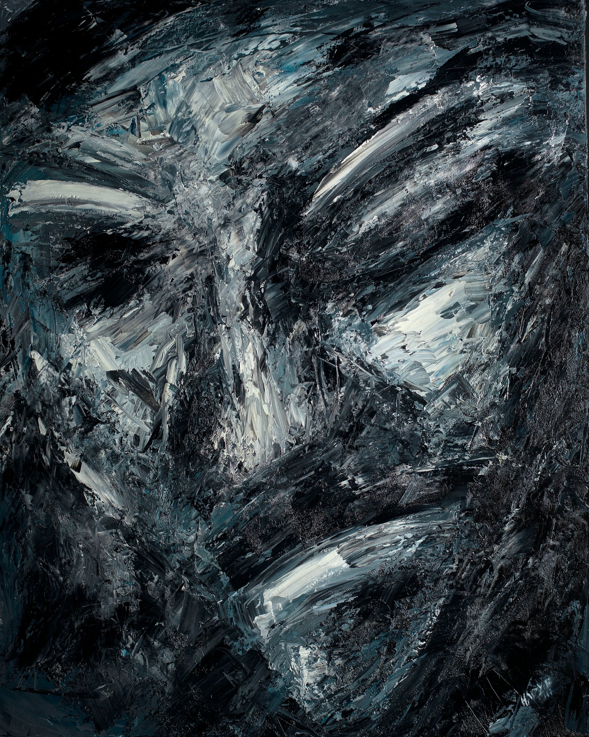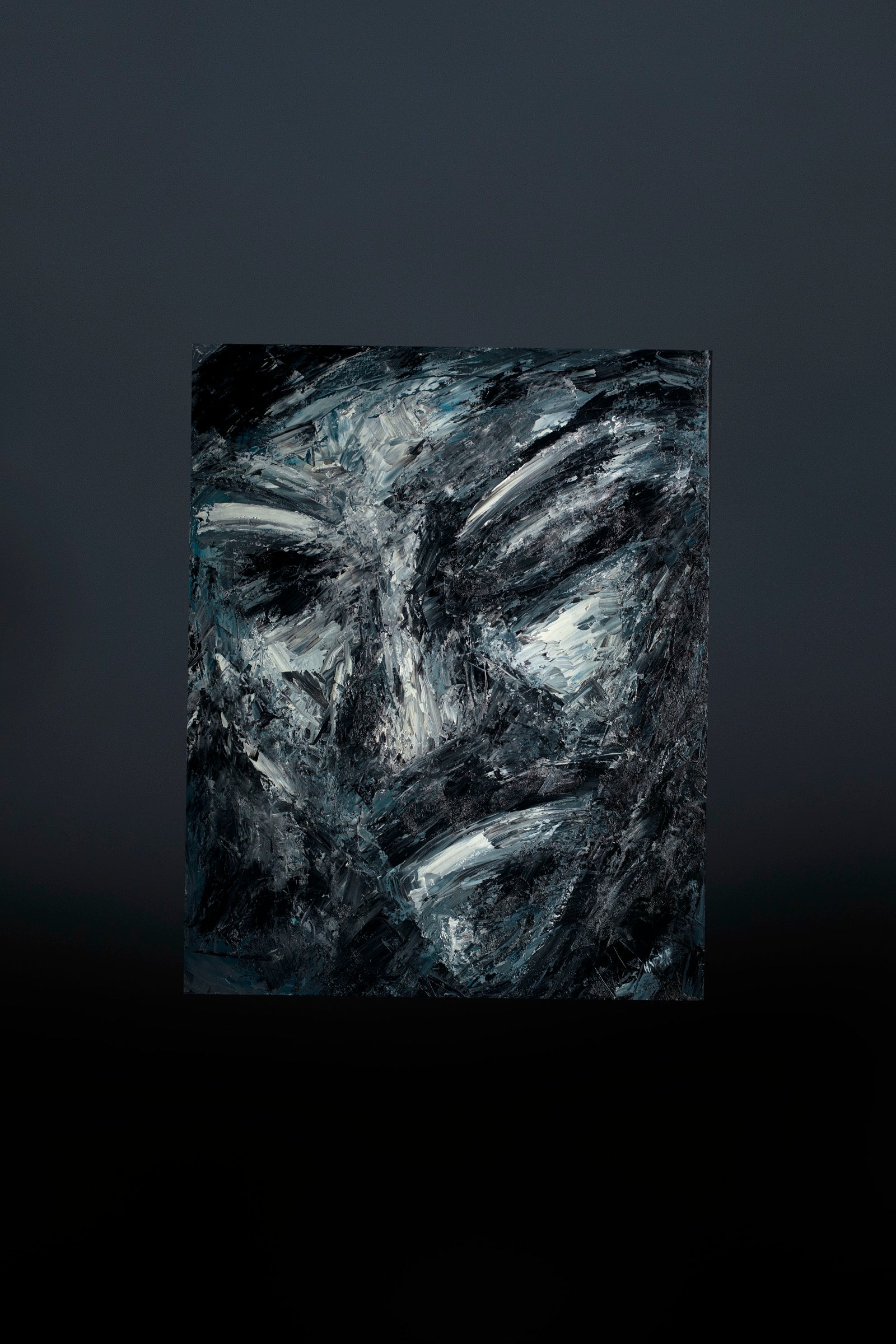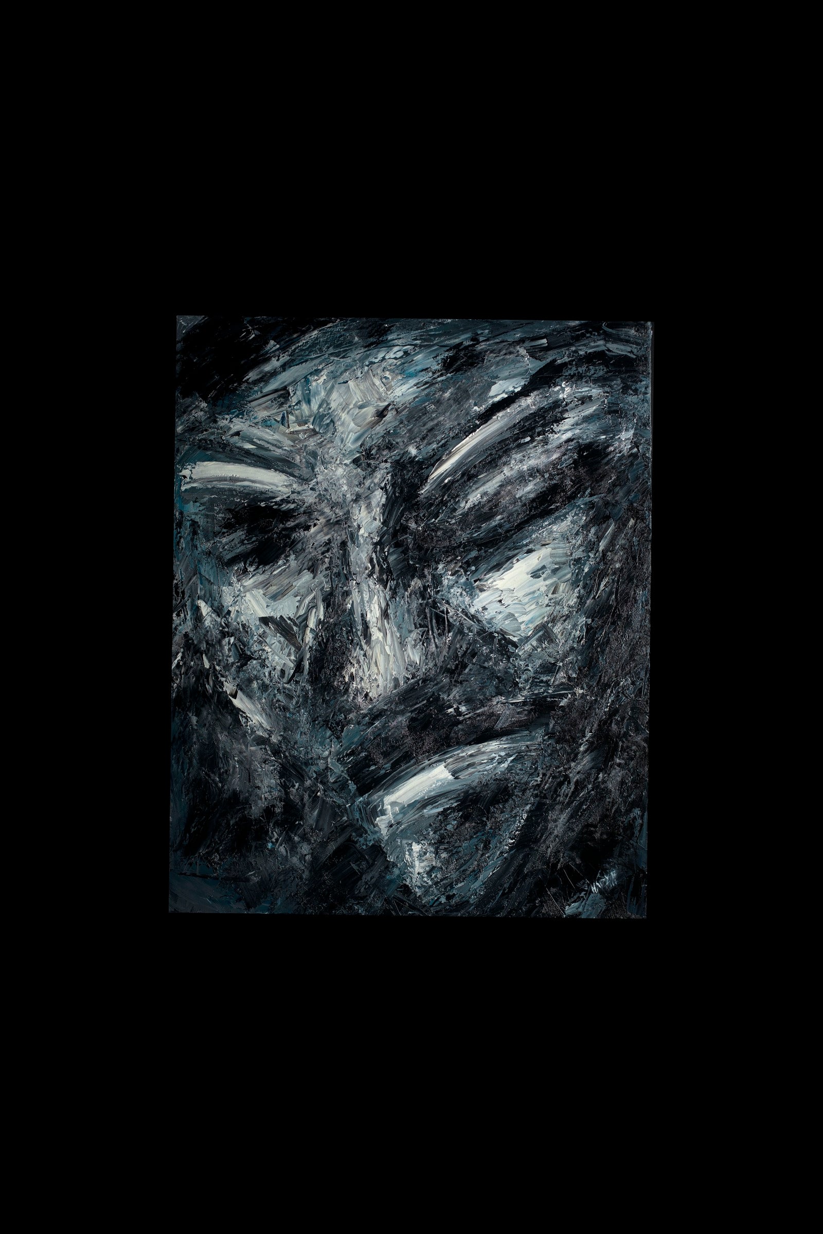 A face dissolves into darkness, not swallowed but stretched, pulled inward by its own weight.