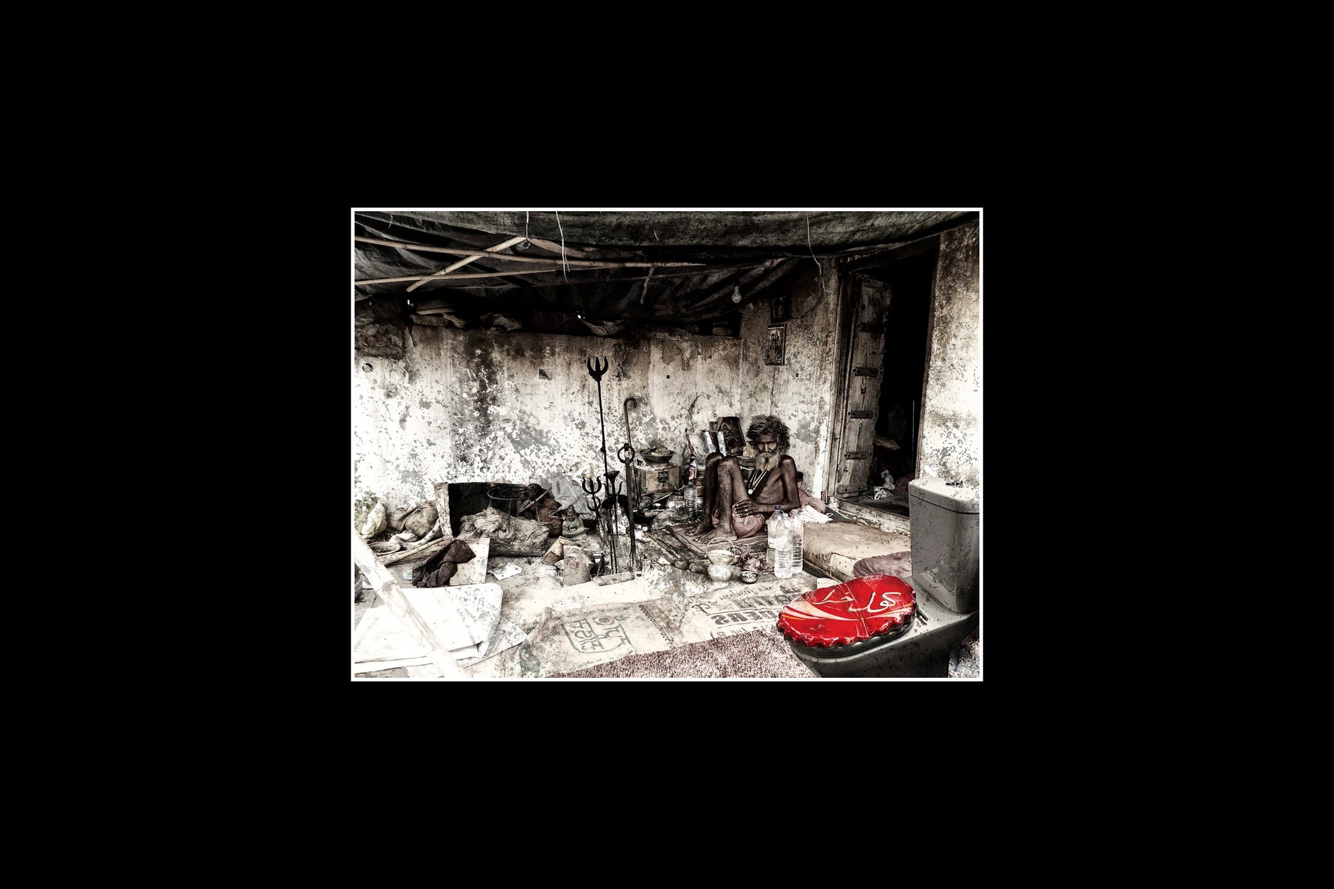 A COLLISION OF PHOTOGRAPHY AND WOOD SCULPTURE. THIS WORK MERGES DOCUMENTARY REALITY WITH HAND CARVED INTERVENTION, INSERTING SCULPTURAL ELEMENTS INTO LIVED MOMENTS TO EXPOSE THE FRICTION BETWEEN RENUNCIATION AND CONSUMER CULTURE.