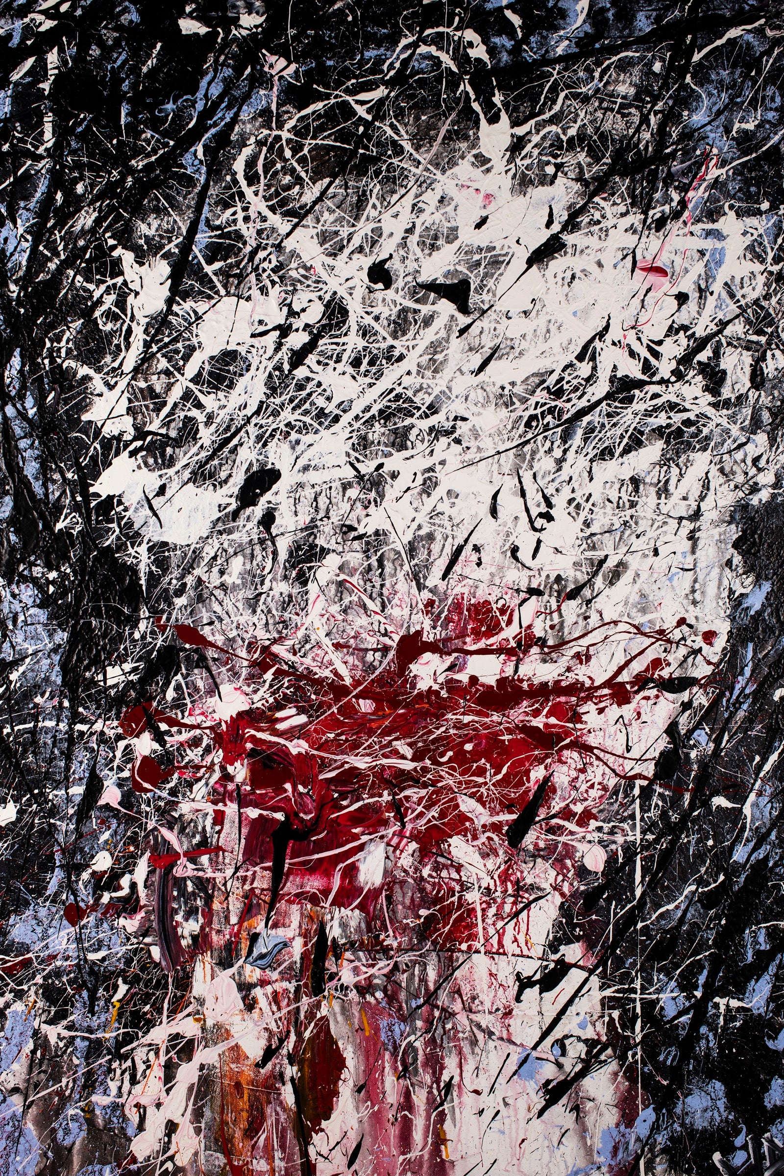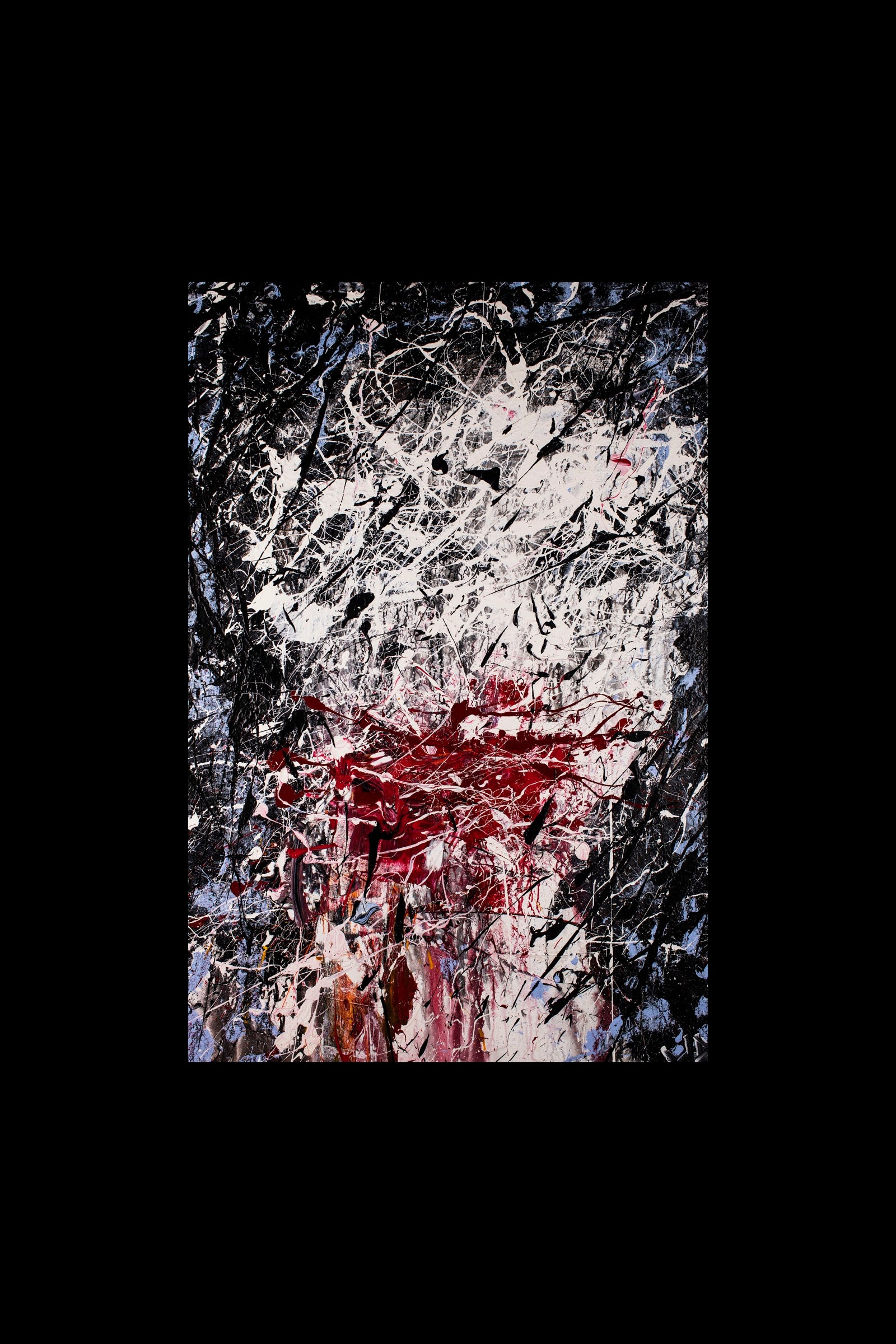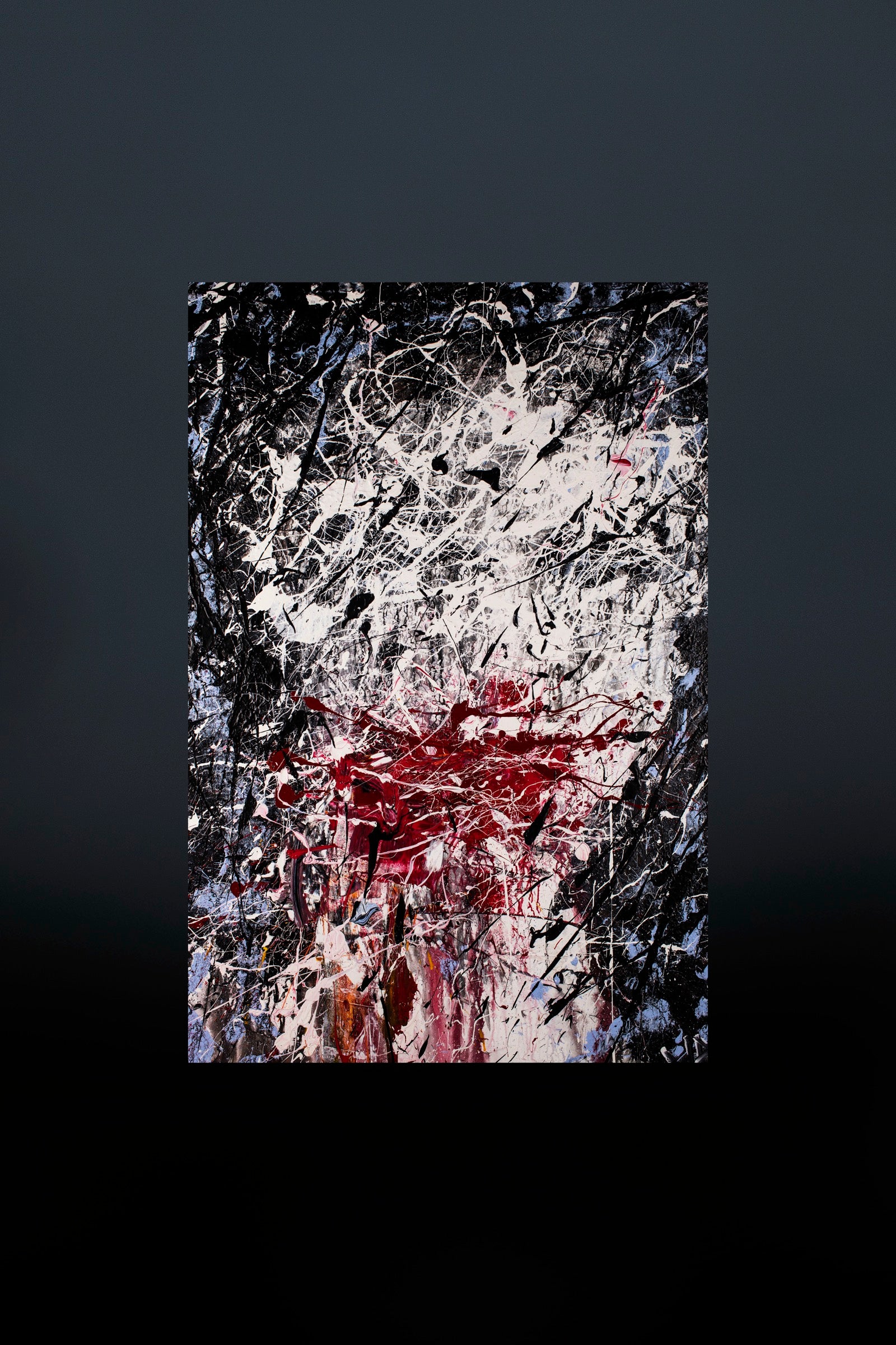 White fractures the space while red stains it marking a moment that cannot be undone.